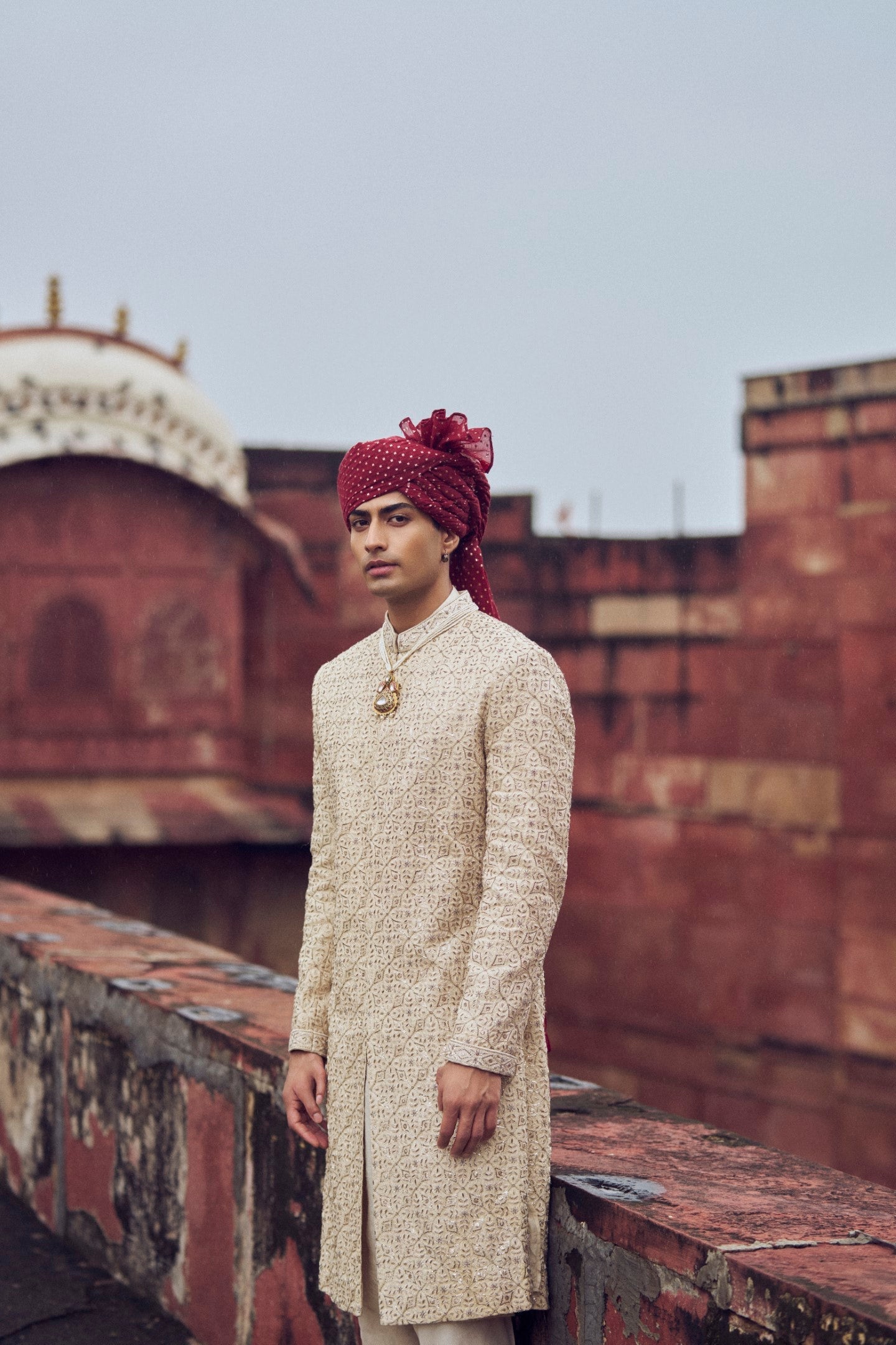 Light beige raw silk sherwani with tonal reshm embroidery highlighted with dabka, nakshi, cutdana and gota with a cotton silk kurta and churidar. it comes with an optional worked belt , chanderi booti stole and matching jutis which can be ordered additionally