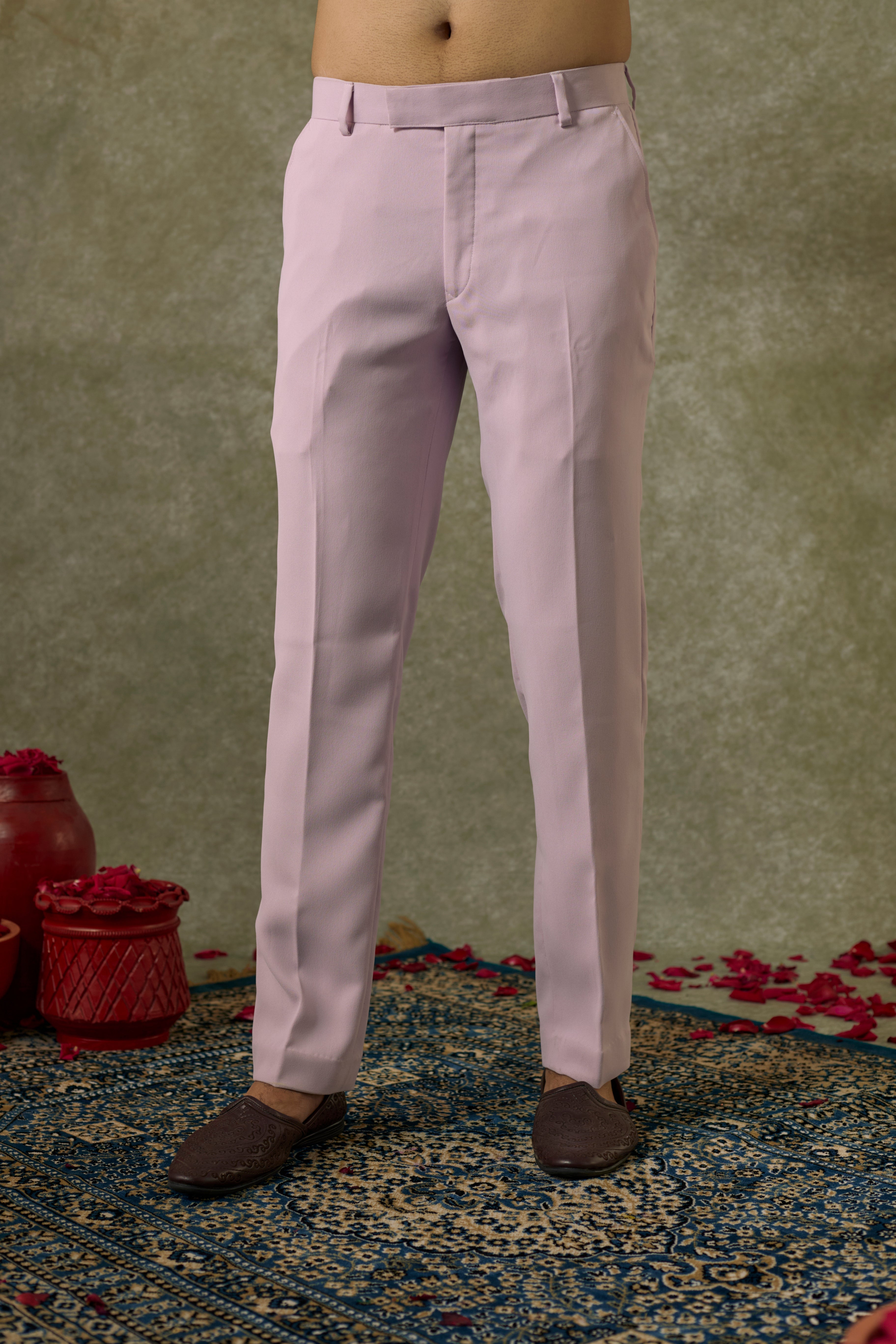 Lilac Jodhpuri Set in Imported Japanese Fabric with placement of Cutdana handwork paired with Matching fitted bottoms best fits for Wedding and Reception.