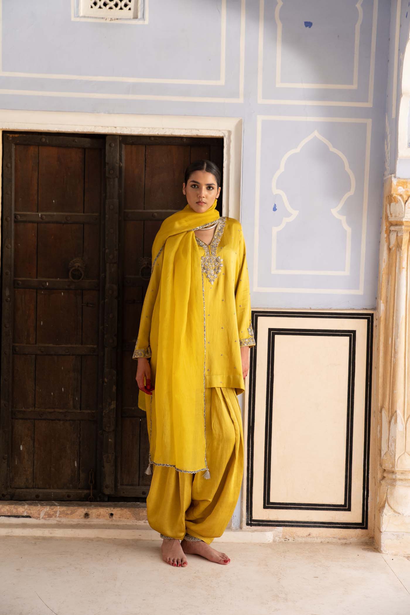 Lime-Yellow Hand-Embroidered Handloom Pure Mashru-Silk (Katan Silk & Cotton) Short-Kurta-Salwar Set