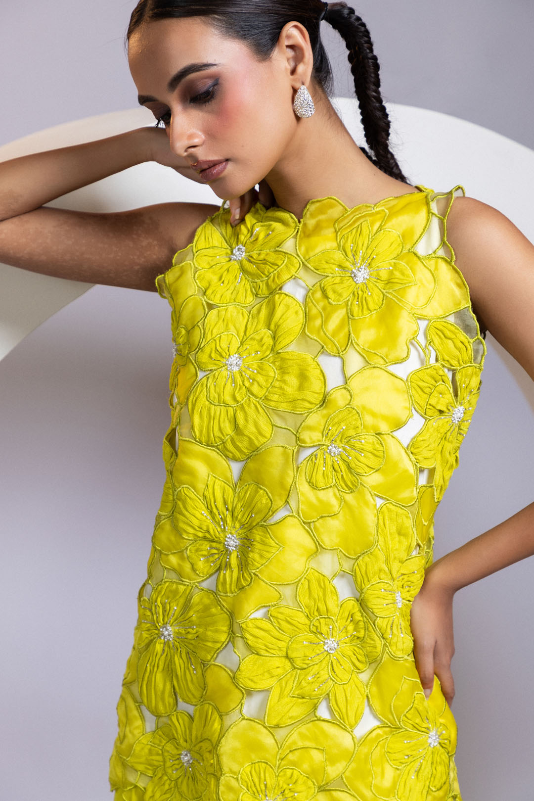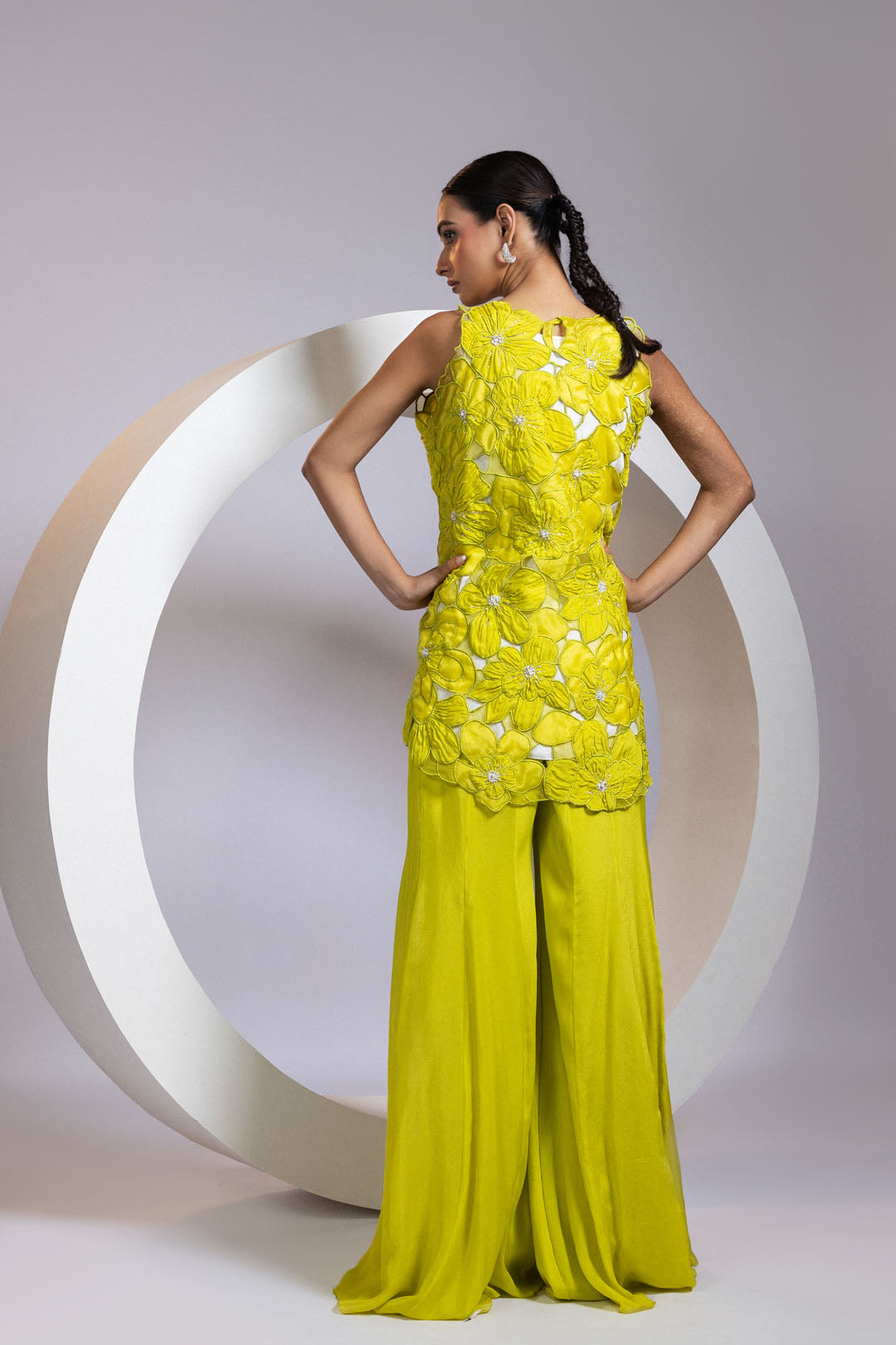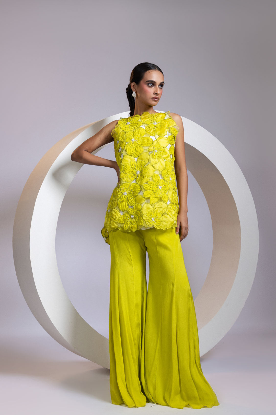 A three-piece coord set in chartreuse yellow, featuring a white inner layer and a statement cutwork top adorned with oversized 3D organza florals. Each bloom is finished with pearl clusters and fine beadwork for a soft, textured sparkle. Paired with wide-leg palazzo pants, the silhouette is crisp yet playful. A refreshing pick for daytime festivities and summer celebrations.
