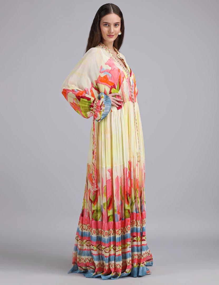 Stand out in this Linear Lime Summer placement kaftan dress, layered over a coordinated slip and finished with delicate embroidery detailing. A fresh statement for elevated resort dressing.