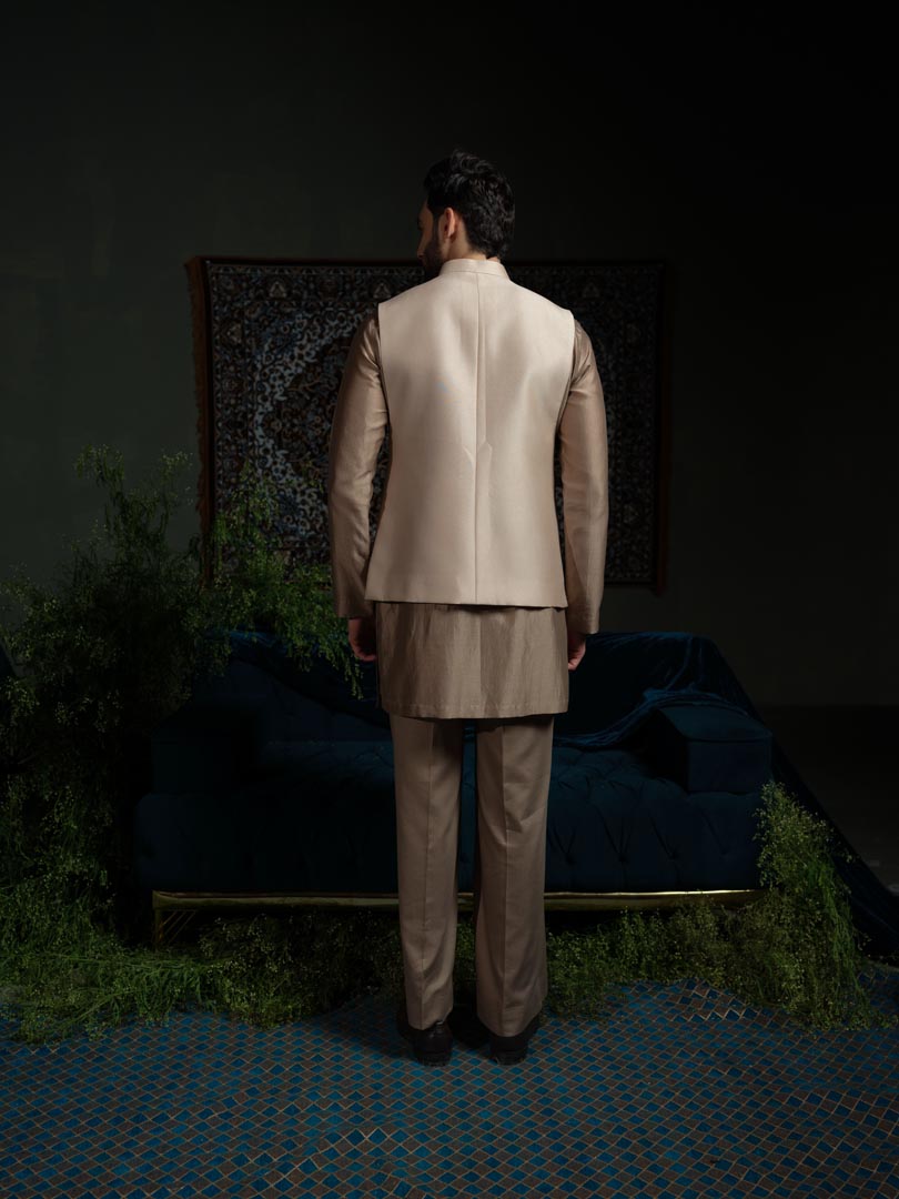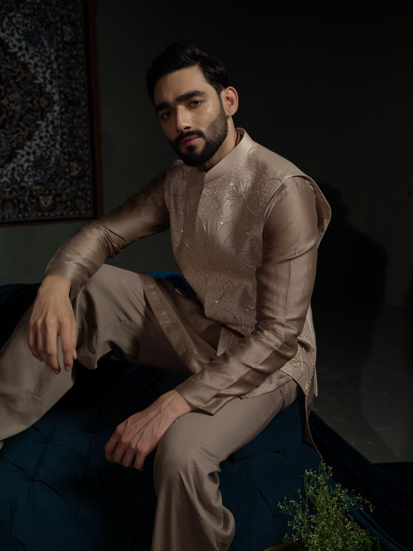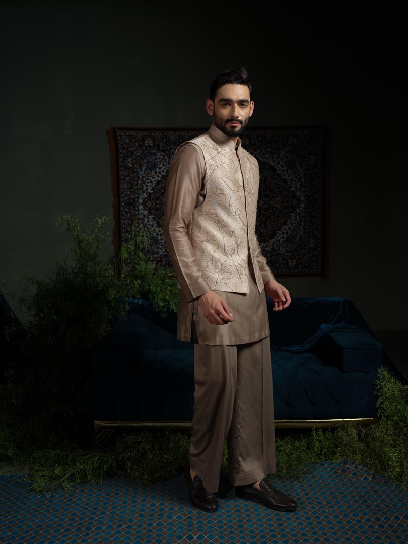 A statement Bundi with hand drawn floral embroidery of beads and pipes, and a deep armhole, made in chanderi silk .