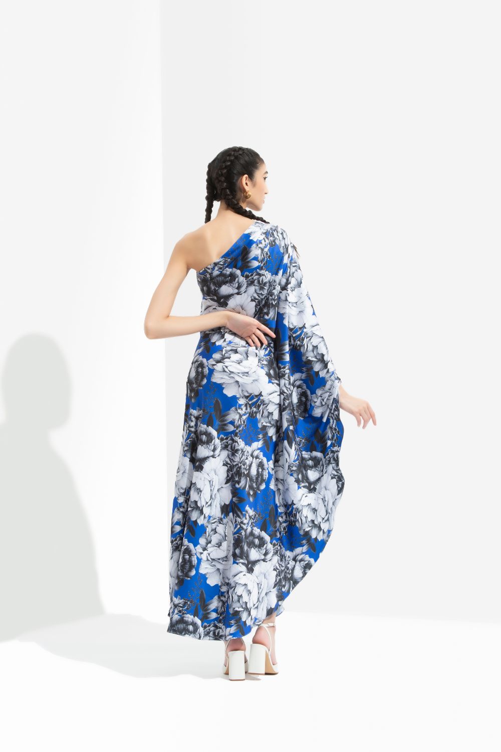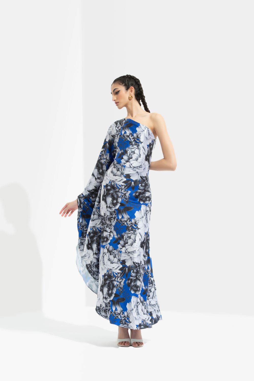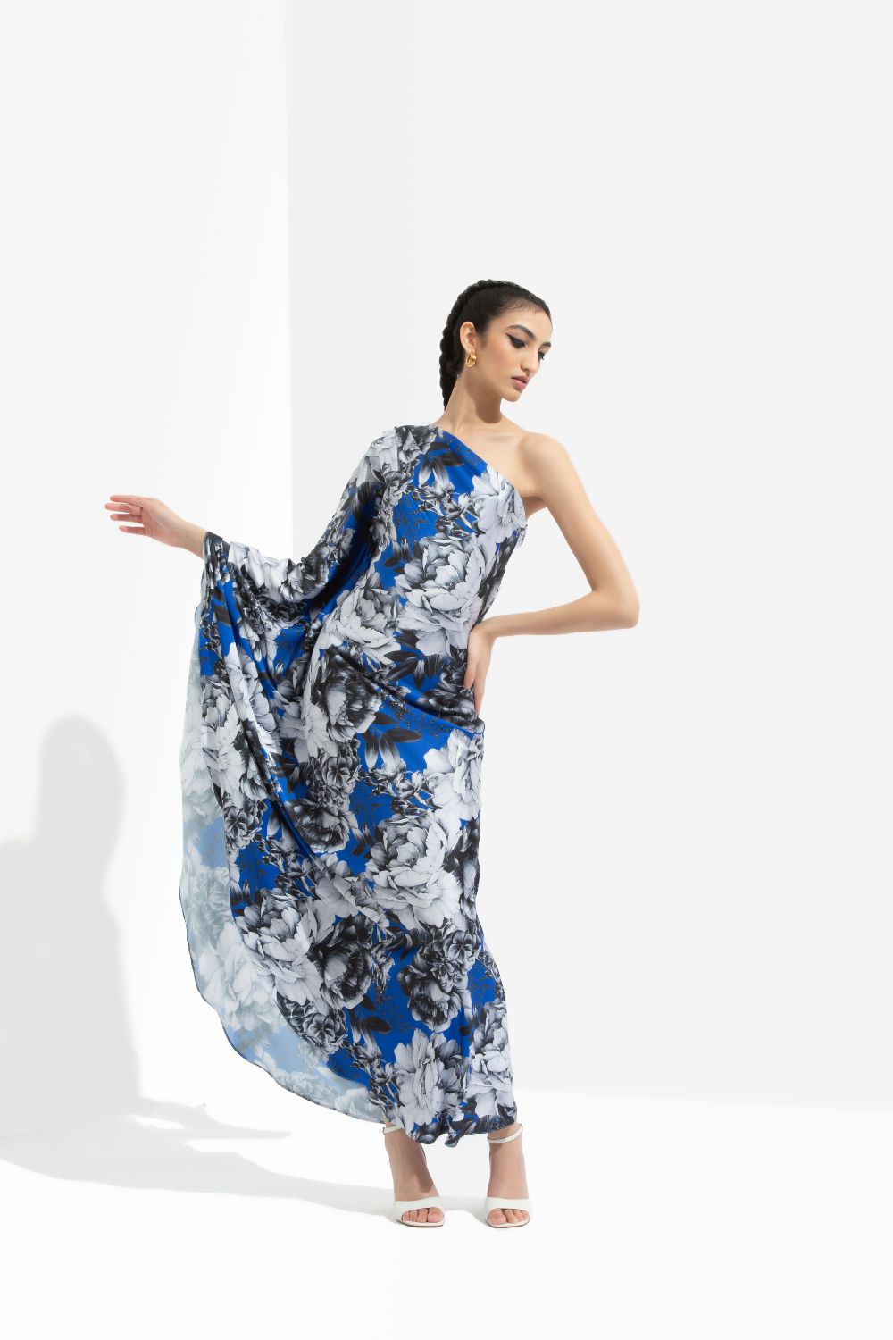 A stunning fusion of style and elegance. Crafted from luxurious Satin in a captivating printed pattern, this dress is a true masterpiece of sophistication. The one off-shoulder design exudes an alluring charm that's perfect for making a statement.