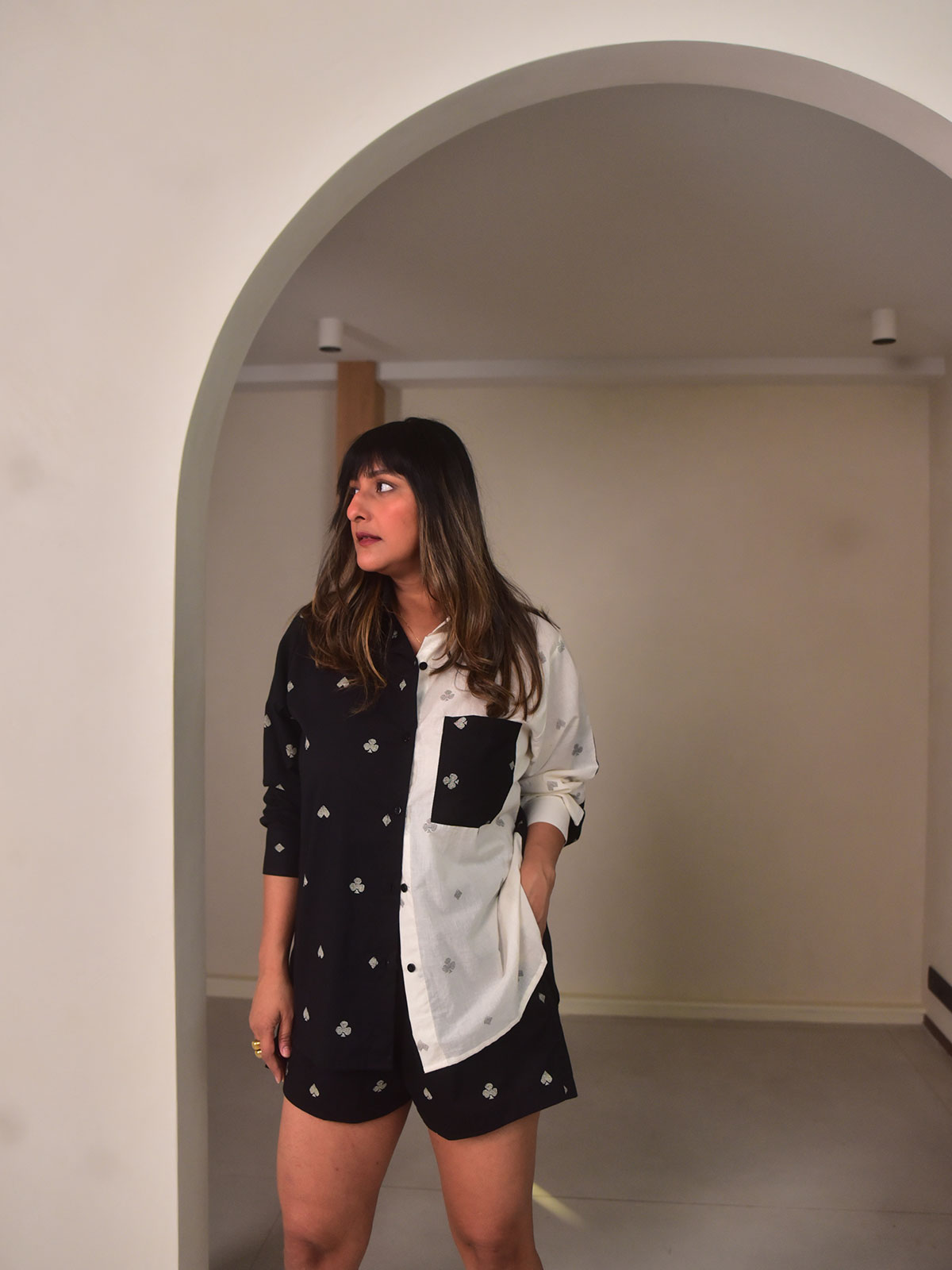 This coordinated set is crafted in exclusive white and black playing cards printed cotton for effortless summer dressing. The half-and-half shirt features a contrast patch pocket and relaxed apple-cut hem, paired with black printed shorts designed with side pockets and an elasticated waist for comfort. Ideal for travel, brunches, or relaxed weekends. Style with flat sandals and minimal accessories for a playful yet polished ensemble.