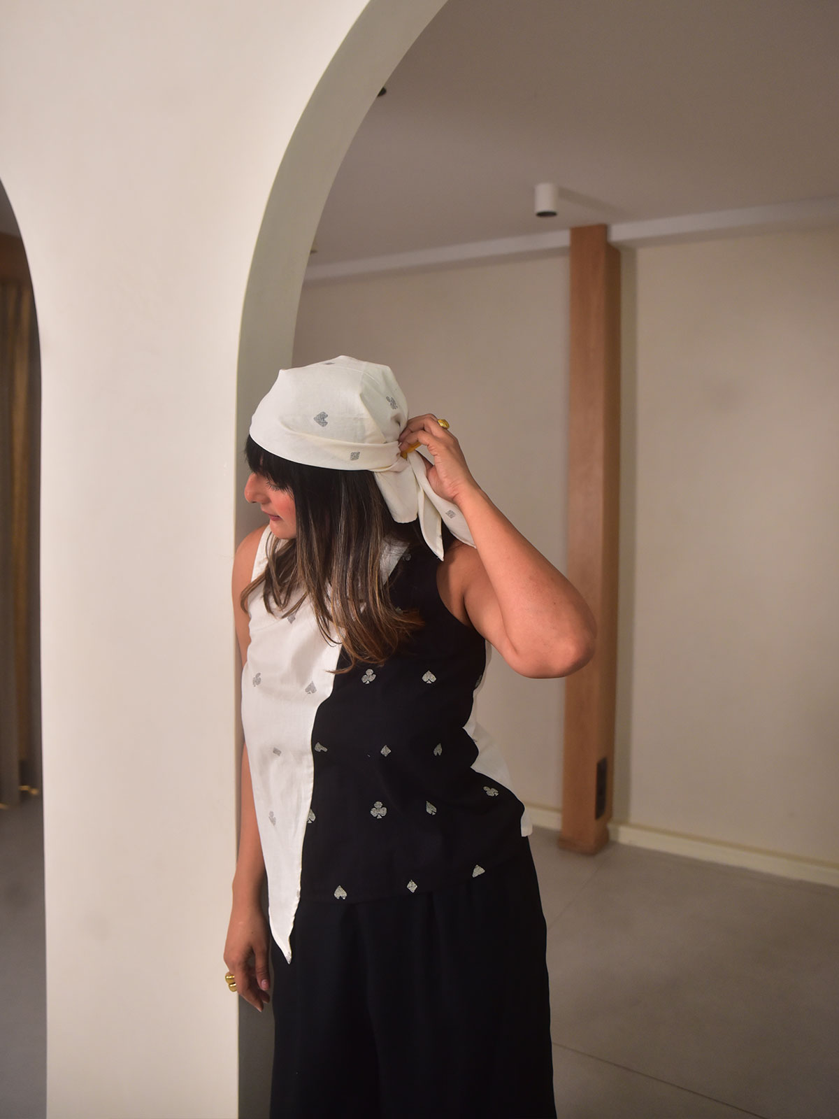 Theis top is a half-and-half sleeveless silhouette cut in exclusive white and black playing cards printed cotton. Designed with an asymmetric hem, closed neckline, and a subtle back slit with hook-and-eye opening, it offers comfort with a contemporary edge. Ideal for creative outings, casual evenings, or day-to-night styling. Pair it with our Juno pants and minimal accessories for a refined statement.