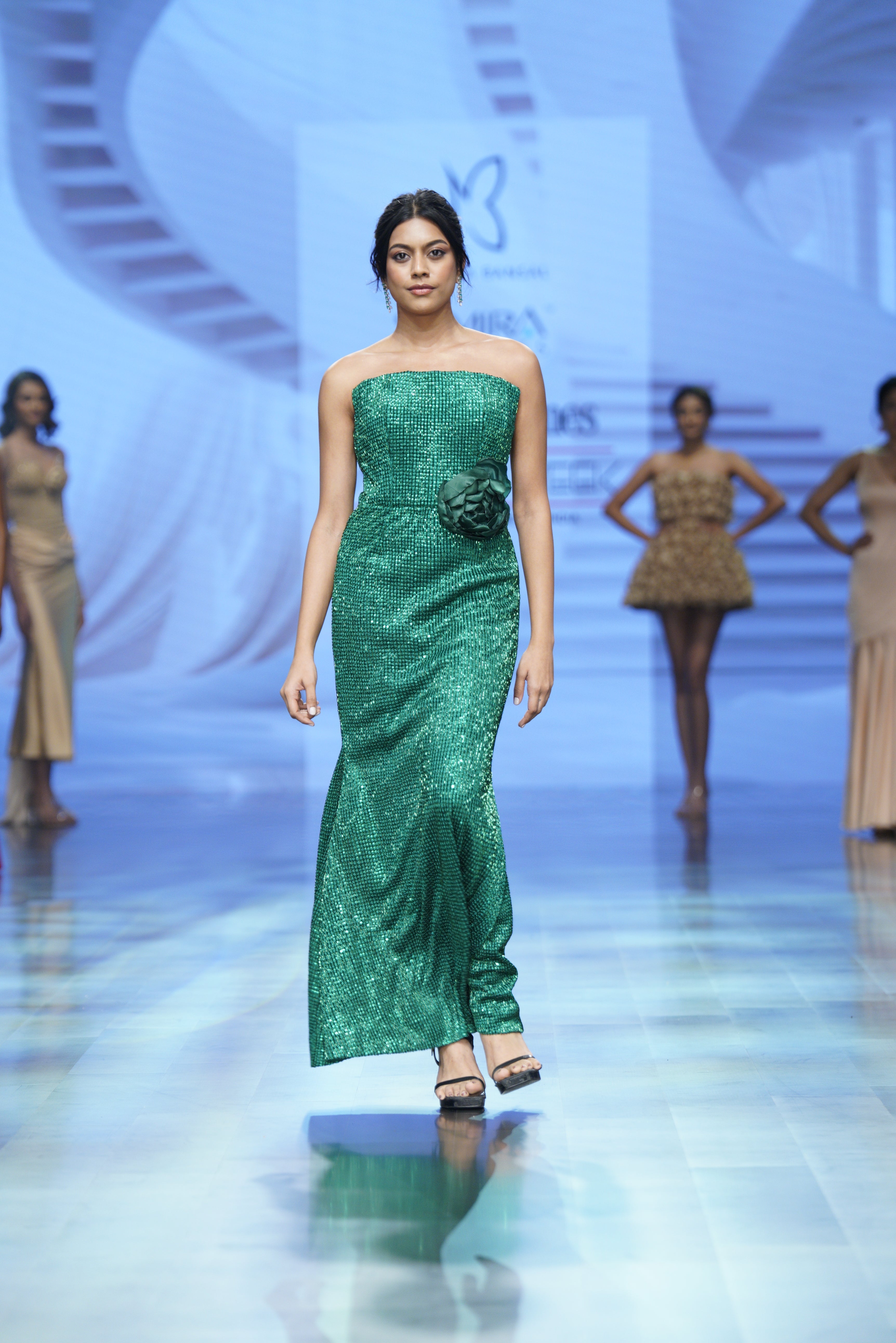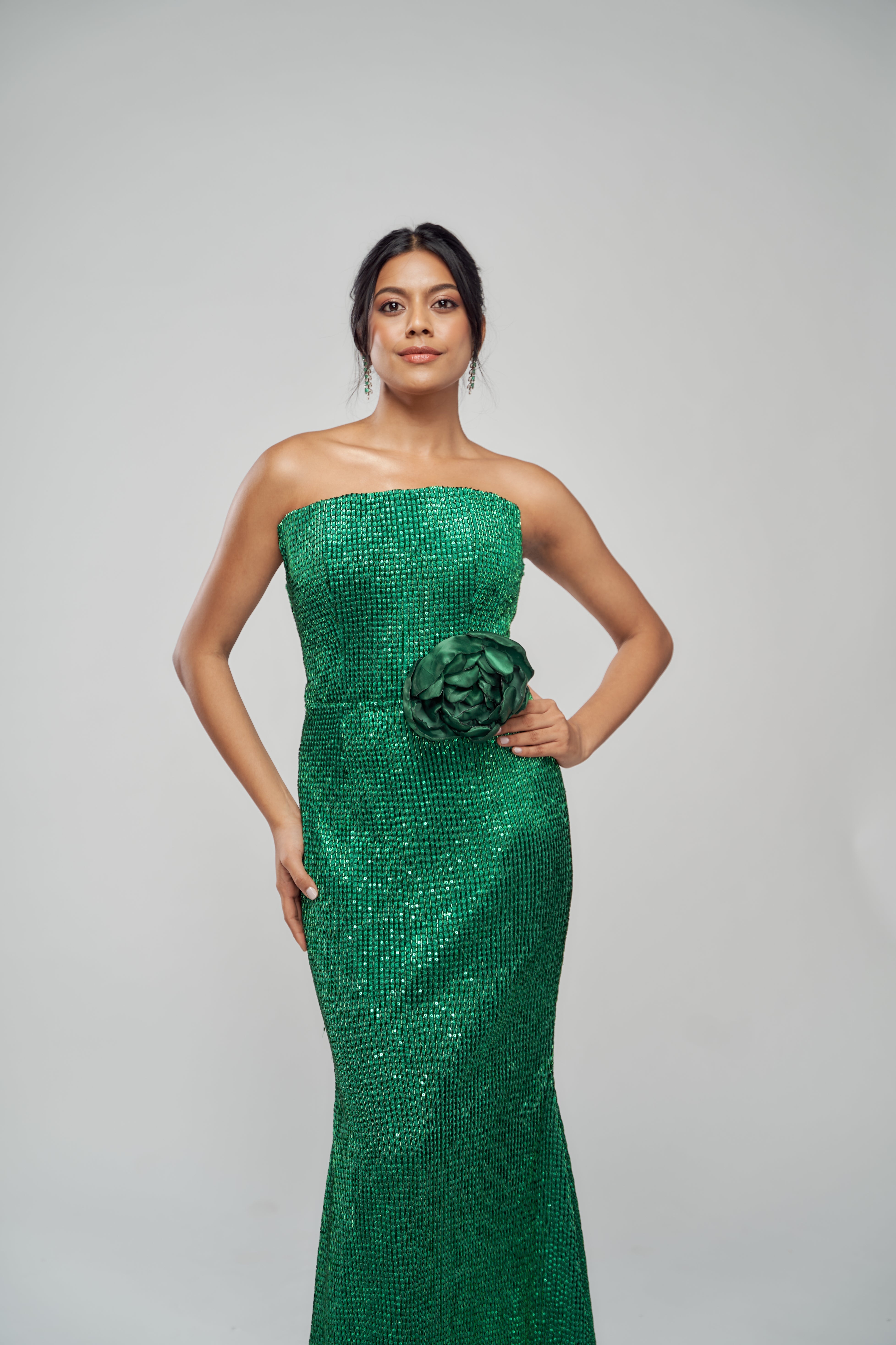 A fully embellished evening gown in sippi, nalki, and resham, crowned with a bold 3D peony—crafted to command a room.