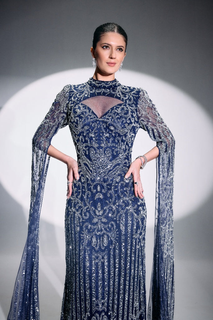 A striking black floor-length gown featuring a V-neckline with thin beaded straps. The bottom of the gown is adorned with luxurious black feathers, accented by vertical beaded lines that add texture and drama. A daring thigh-high slit enhances the gowns bold elegance. The bodice is richly embellished with intricate beading that forms a unique pattern, resembling rows of sparkling lines, creating a mesmerizing and sophisticated effect.