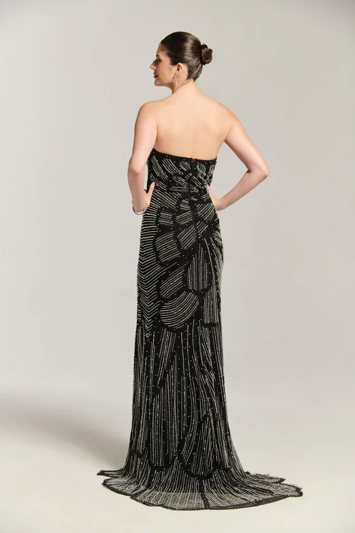 A captivating black floor-length gown featuring a fitted bodice and a flowing skirt. The gown is embellished with intricate beading, with small, shiny beads forming a delicate floral pattern. The beading is most concentrated around the neckline, bodice, and waistline, creating a dazzling effect that adds both elegance and glamour.