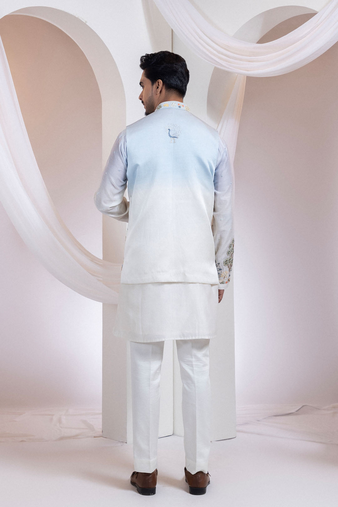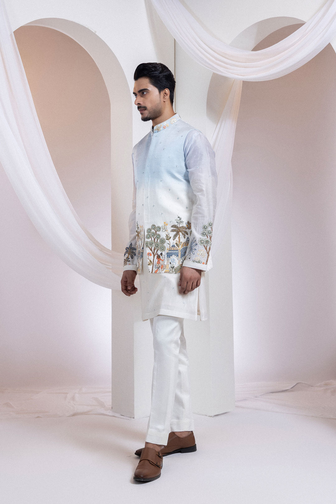 The nehru with omre effect features delicate scattered french knots and beads emboirdery , while the lower panel is intricately adorned with vibrant Madhubani-style embroidery. The artwork depicts scenes of nature, traditional domes, peacocks, and figures in a celebratory setting, using multicolored threadwork and subtle bead embellishments. Finished with a detailed floral embroidered collar.Ideal for festive and wedding occasions.
