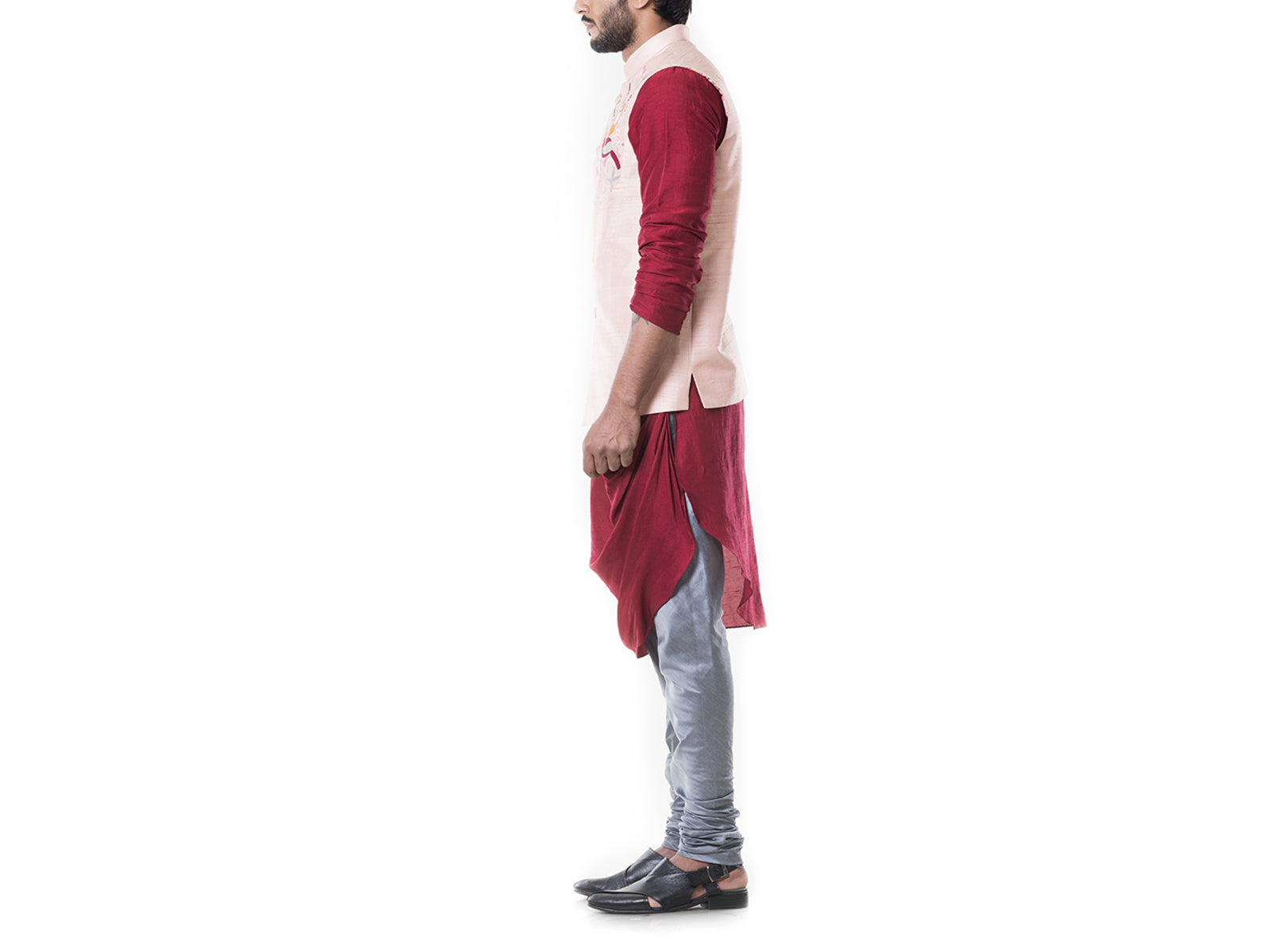 Featuring a maroon cowl kurta set with grey churidar with pink waist coat embroidered with thread.