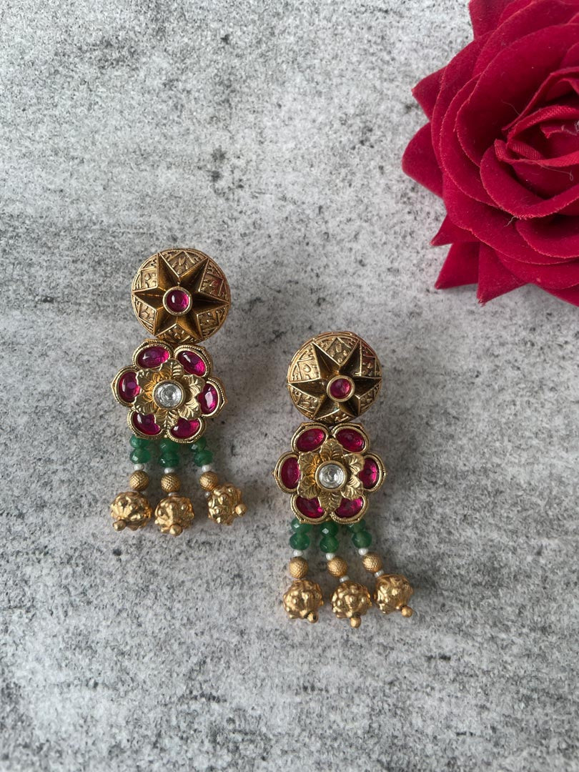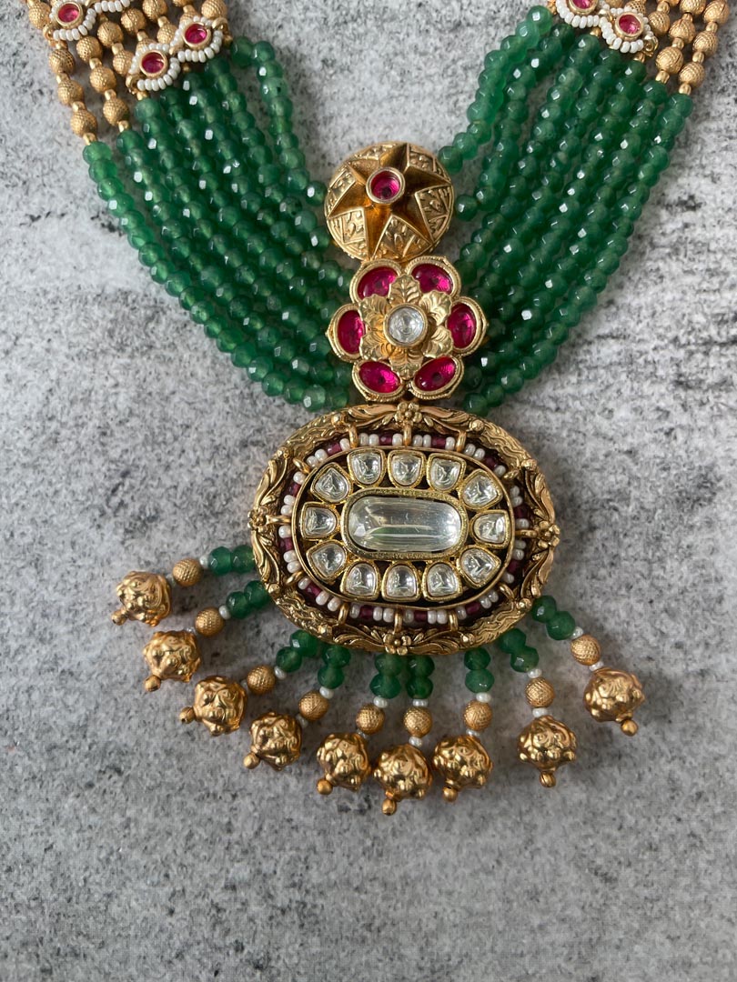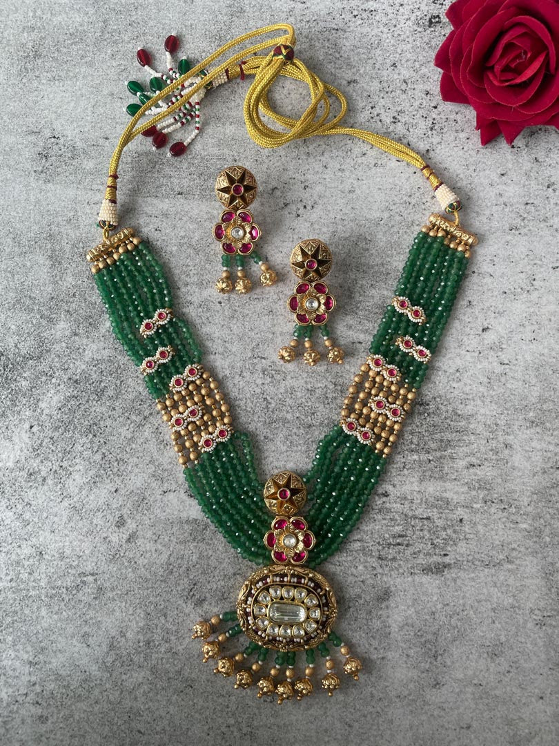 Matte Gold Finish Temple Style Long Beaded Necklace Set , Necklace: L:9", W: 1"