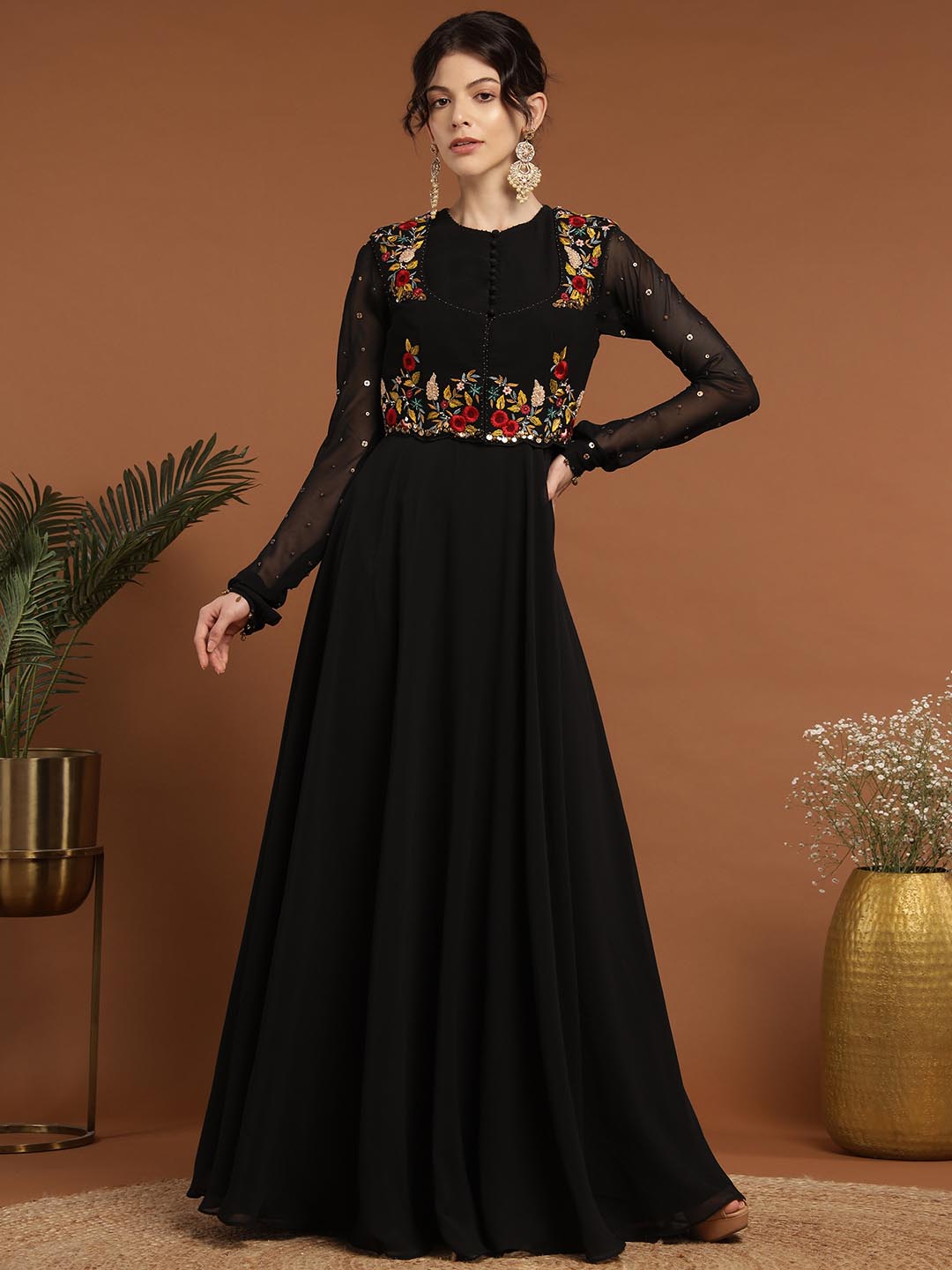 This stunning MAYURA Anarkali jacket set features premium Georgette Fabric. Adorned with intiricate