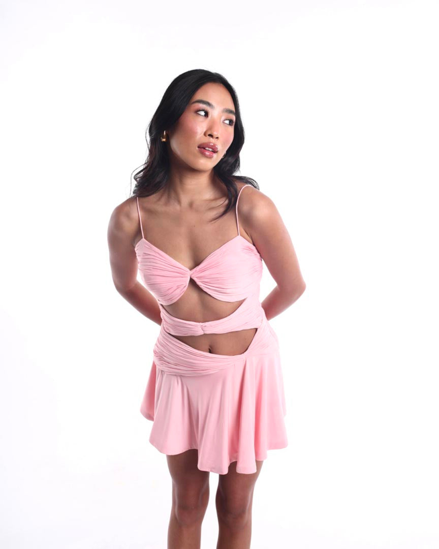 The MEI dress is your playful, flirty go-to with a modern twist. Featuring a twisted bustier bodice, strategic midriff cut-outs, and a flowy mini skirt, this dress is designed to hug and highlight the body in all the right places. Delicate spaghetti straps add to its youthful charm, while the soft blush pink gives it a dreamy, romantic feel.