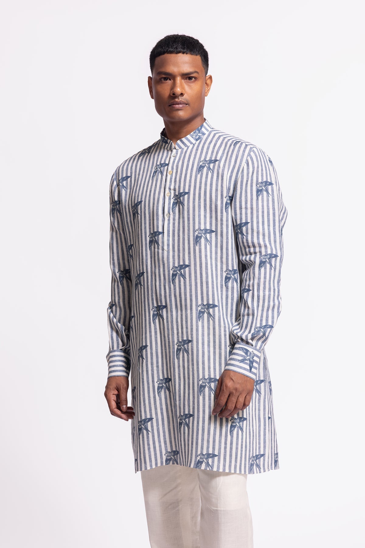This men's short kurta features a unique bird print design, crafted from breathable linen for a comfortable and stylish fit. Equipped with two practical pockets, it combines both style and functionality. Ideal for casual outings or relaxed gatherings, this kurta offers a blend of modern aesthetics and timeless comfort.