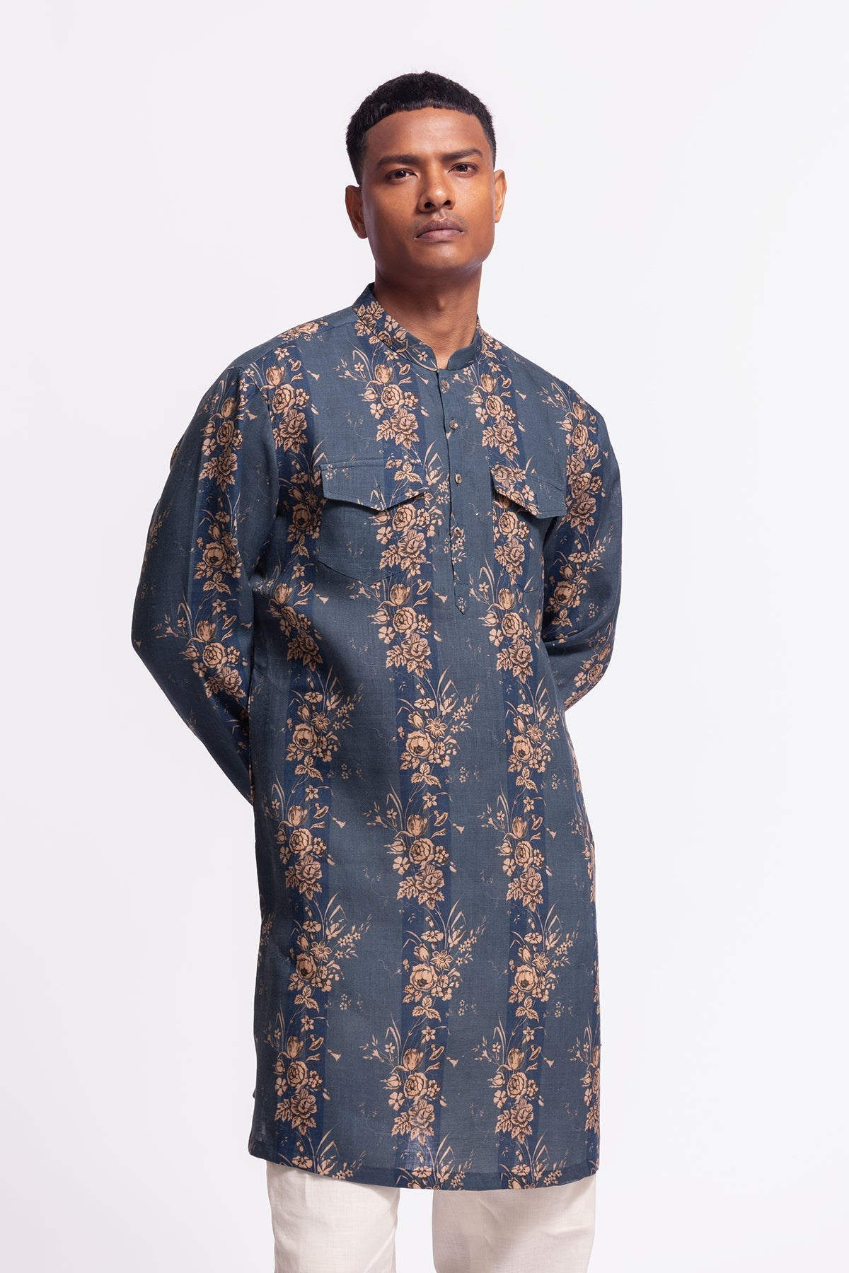 Elevate your casual wardrobe with this men's floral printed short kurta. Crafted from breathable linen, it offers comfort and style in equal measure. Featuring two practical pockets, this kurta is perfect for a relaxed, yet refined look. A versatile piece that can easily transition from day to night, adding a touch of modern flair to your wardrobe.