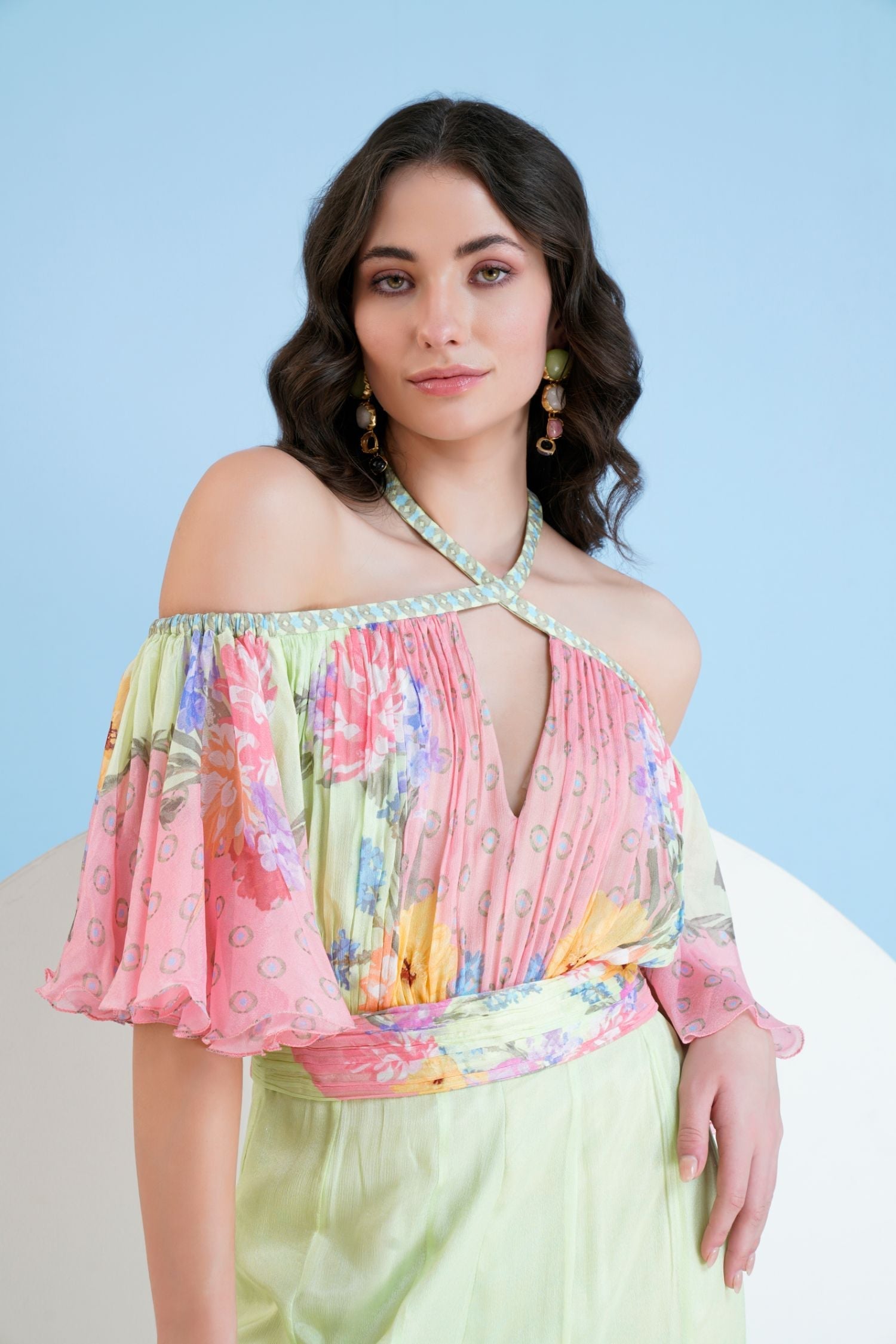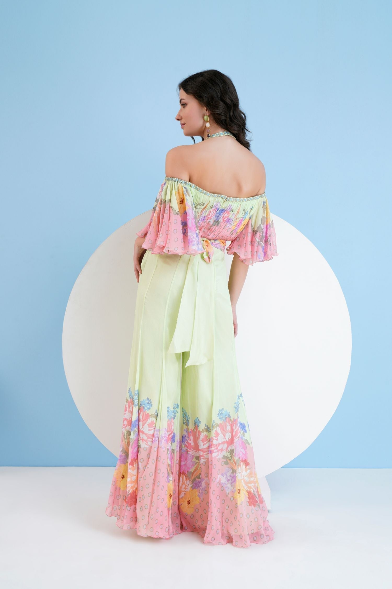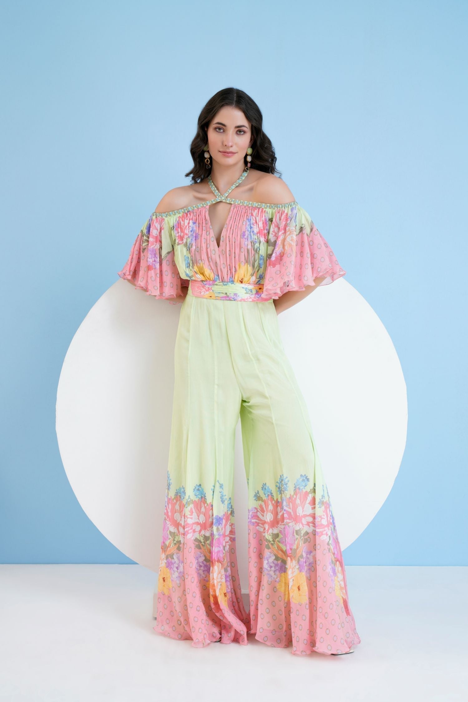 Featuring a Meridian printed flared jumpsuit in chiffon with a placement print, cross neckline, and flared sleeves.