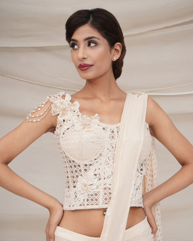Lace appliquéd corset with pearl and crystal shoulder strings. This silhouette is romantic with a modern twist, made for moments that matter.