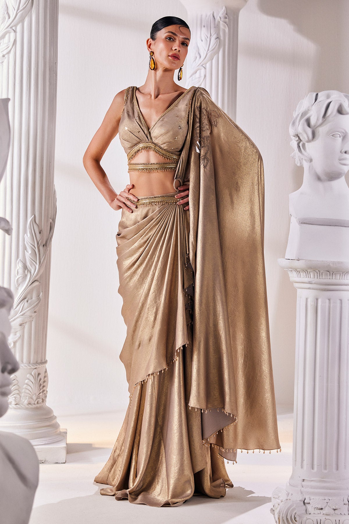 Metallic antique gold drape saree, adorned with an embellished belt. Paired seamlessly with a luxurious metallic blouse.