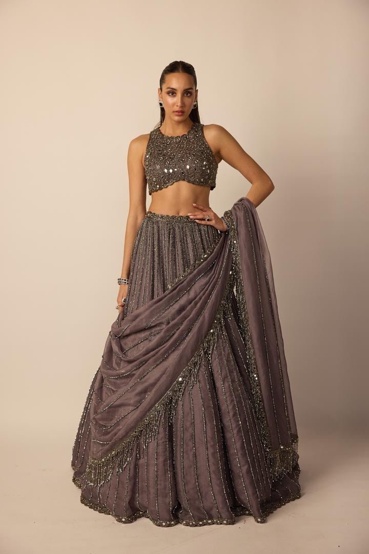 Metallic Grey Intricately hand embroidered Linear Lehenga Dupatta featuring Cutdana and crystal embroidery clubbed With zero neck blouse.