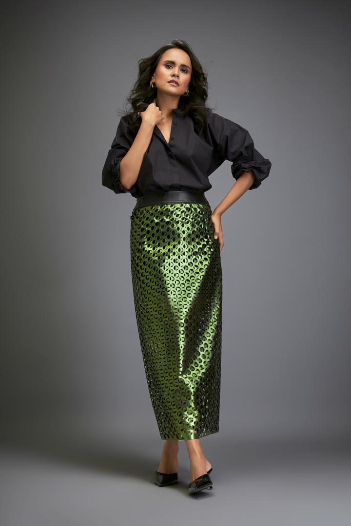 Double Layered Metallic Green Skirt With Getometric Cutout Detailing With Inner Skirt