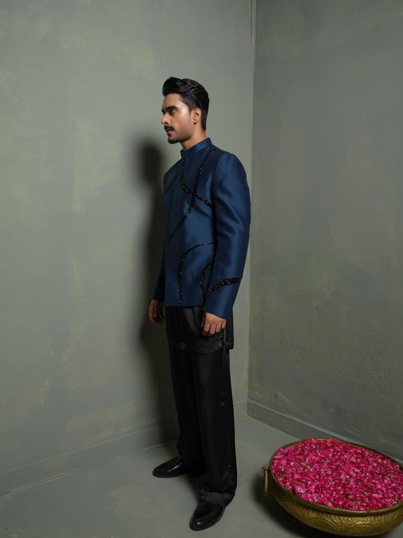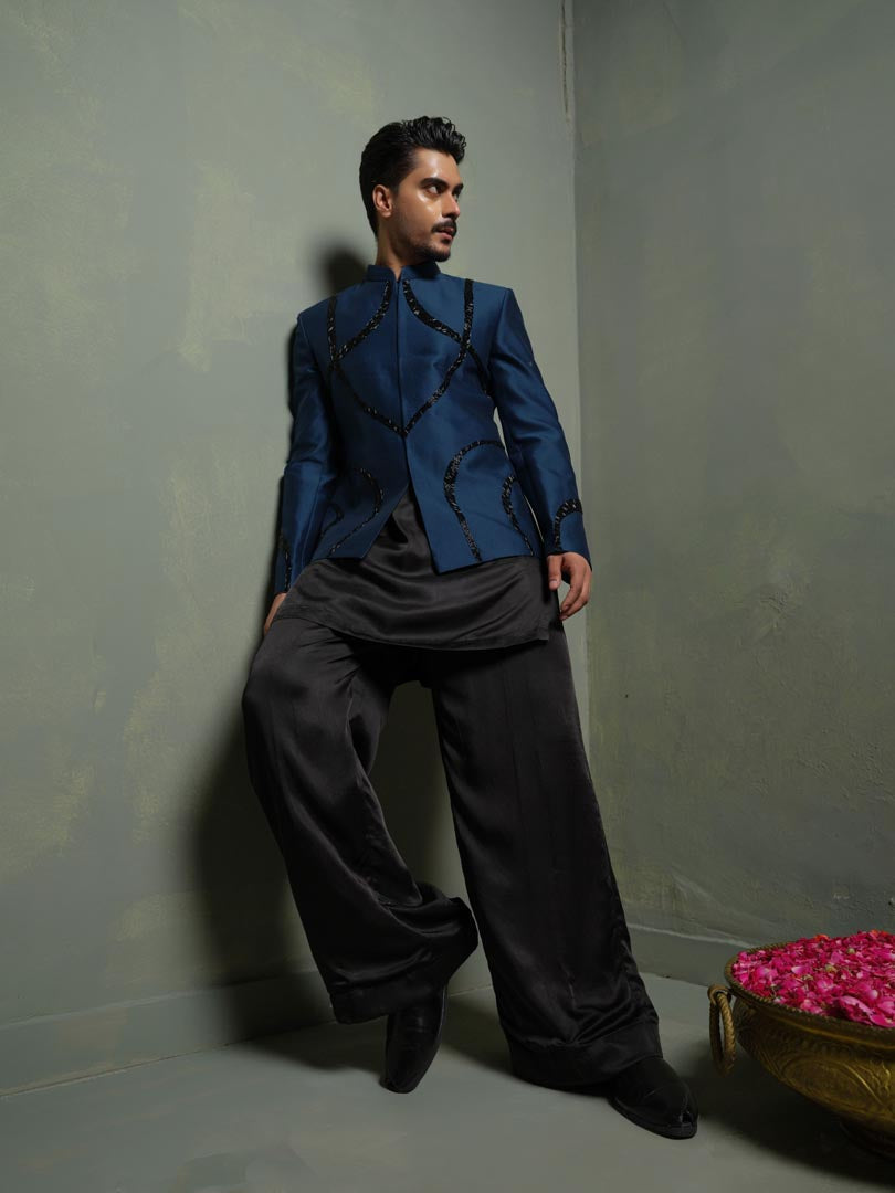 A statement Blue Jodhpuri in silk with significant structured multi-bead embroidery is paired up with Short kurta and flare pants for en edgy modern man Indian look.