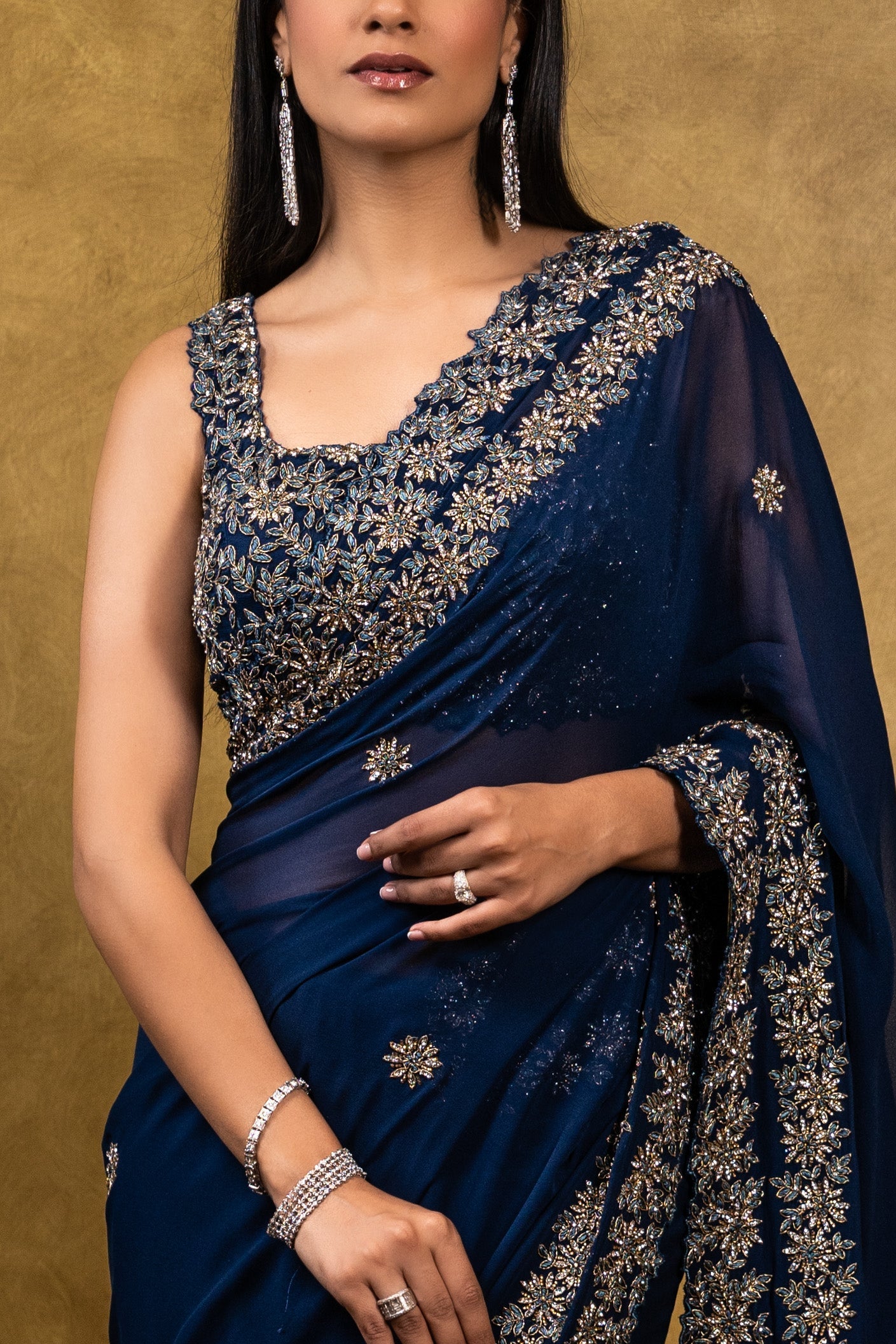 Midnight blue georgette saree with antique zardozi embroidery