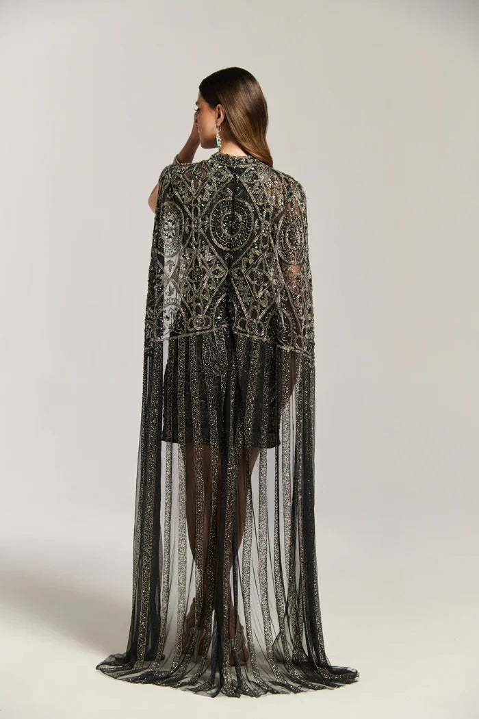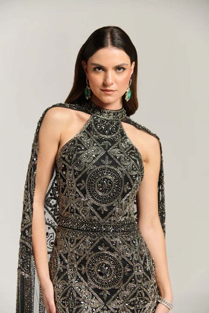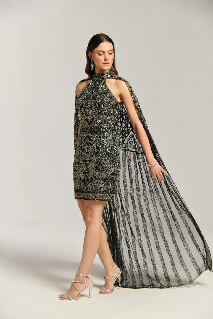 A sleek black sleeveless dress with a halter neckline, featuring a sheer beaded cape overlay that gracefully extends to the floor. The dress is adorned with a repeating geometric design of black beads and silver-tone sequins, adding texture and elegance. The cape features a striking vertical striped pattern, while the fitted dress style ends just above the knee, offering a flattering and sophisticated silhouette.