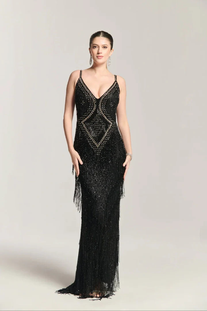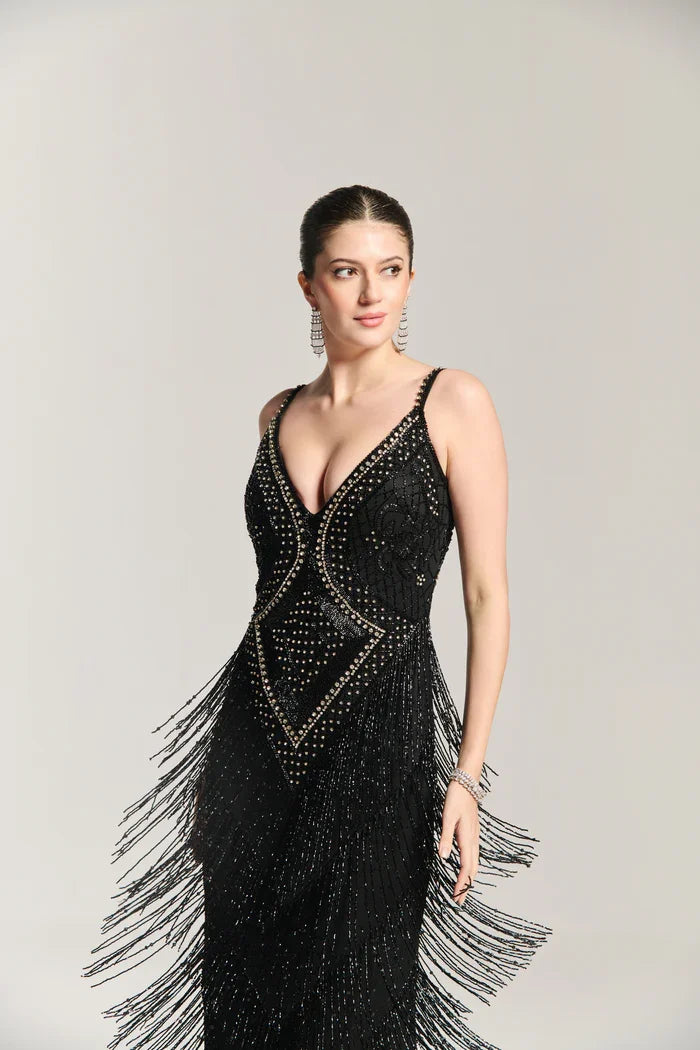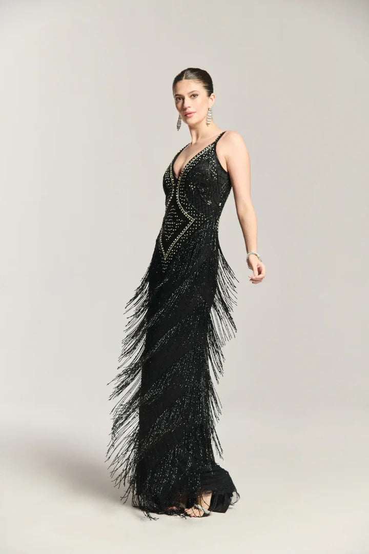 A stunning black gown featuring a flattering V-neckline, with fringe detailing elegantly adorning the skirt. The gown is embellished with black beads and silver stone accents, which gracefully outline the neckline and are strategically placed throughout the garment, adding a touch of sparkle and sophistication.