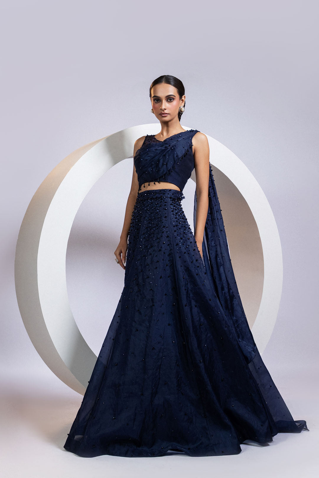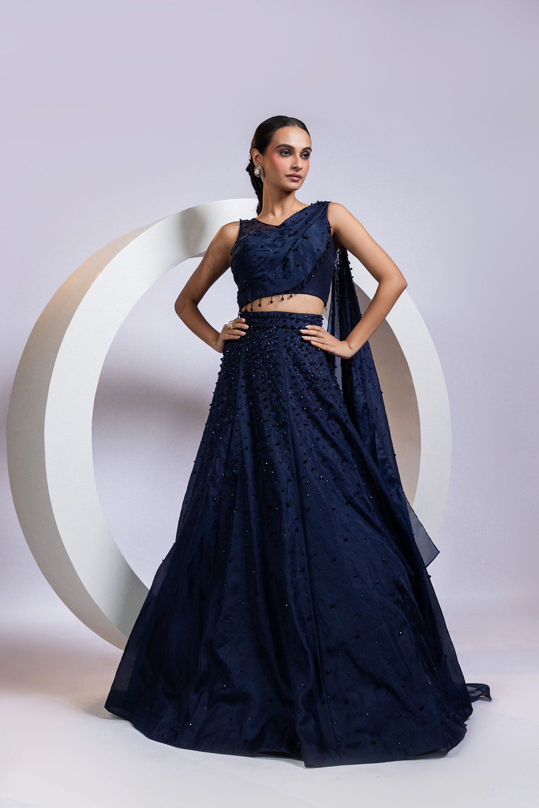 A navy blue drape lehenga set featuring a one-shoulder net strap blouse with structured pleating and an attached veil-style dupatta. The blouse and flared skirt are hand-embellished with scattered black crystals, creating a soft, starry shimmer. Fluid yet sculpted, the silhouette is equal parts drama and grace. Perfect for cocktail weddings, receptions, and elegant evening affairs.