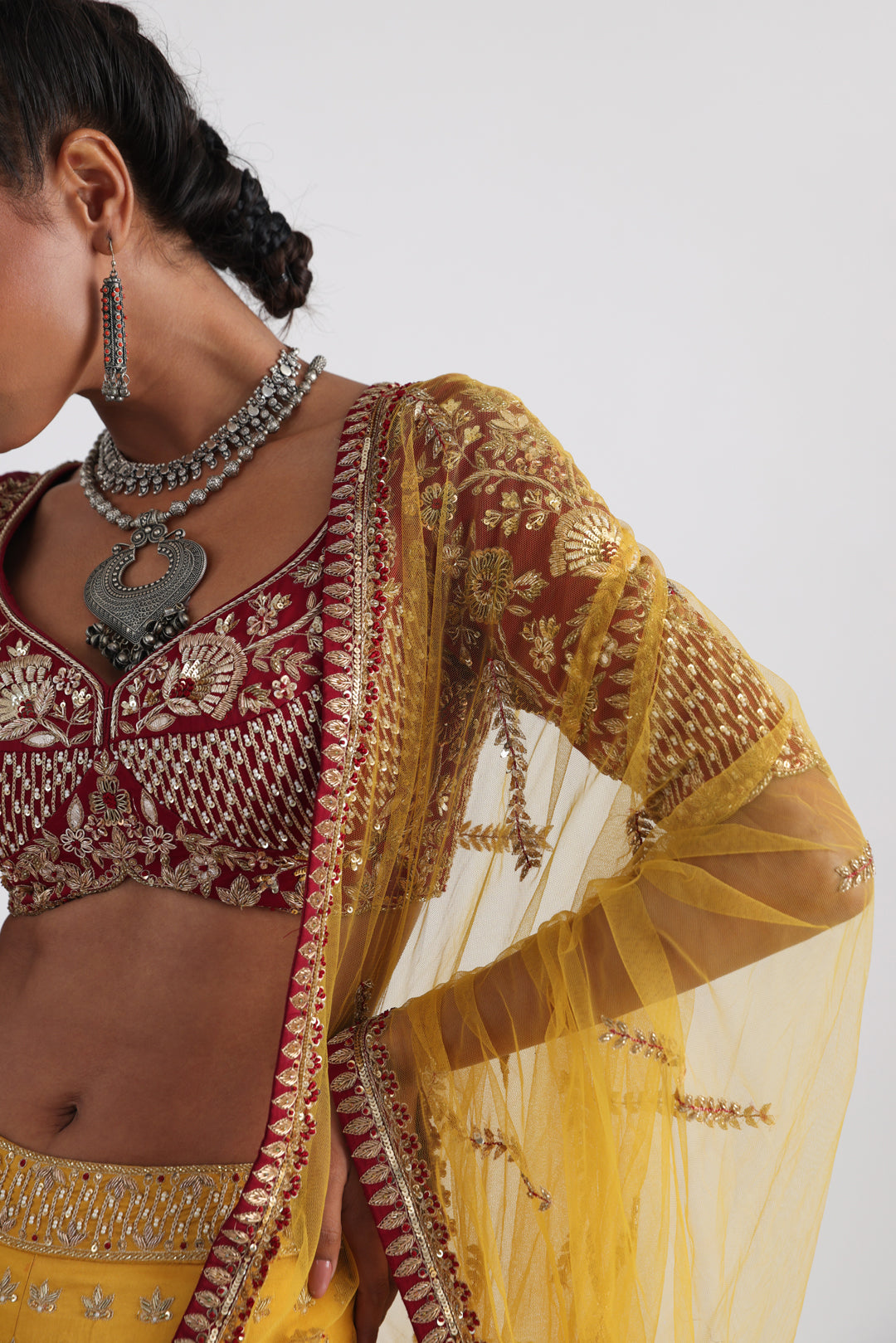 Mustard yellow lehenga features dabka embroidery, tiny pearls, sequins and hints of maroon, paired with a contrasting maroon blouse heavily embellished with gold.