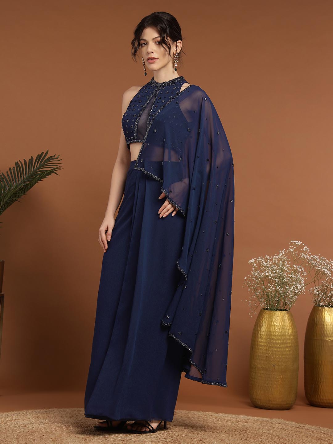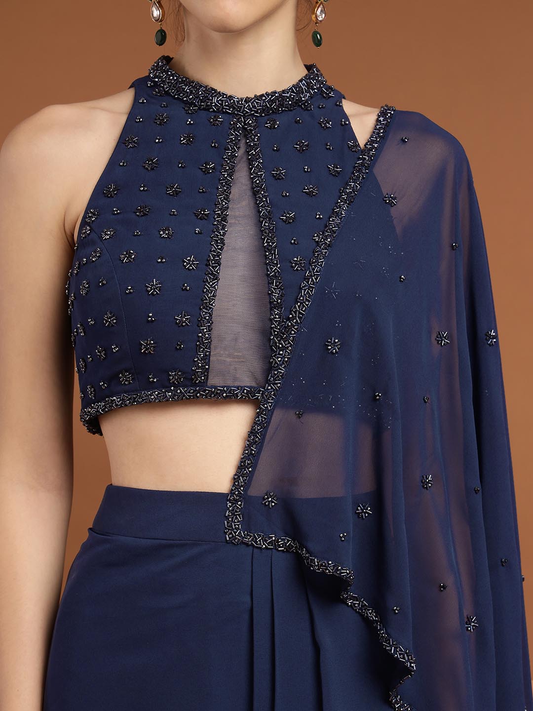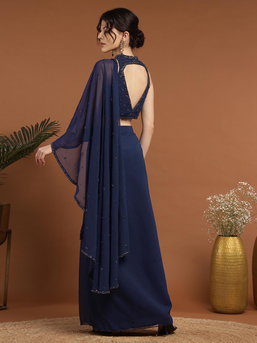 Experience opulence with our Mohnish Sari Set. Expertly crafted from premium georgette, each piece features intricate hand embroidery. The blouse features a beautiful neckline with eye-catching detailing and a show-stopping back, paired with a draped stitched saree. The set boasts intricate craftsmanship, perfect for intimate or formal occasions.