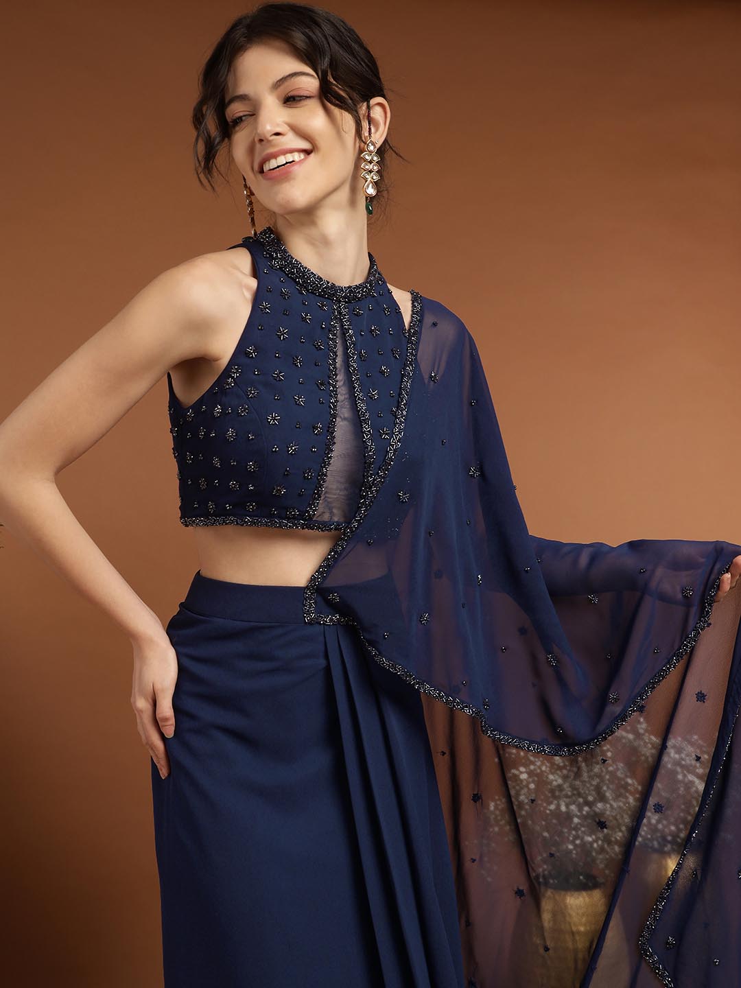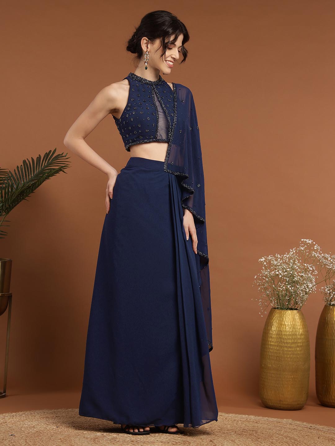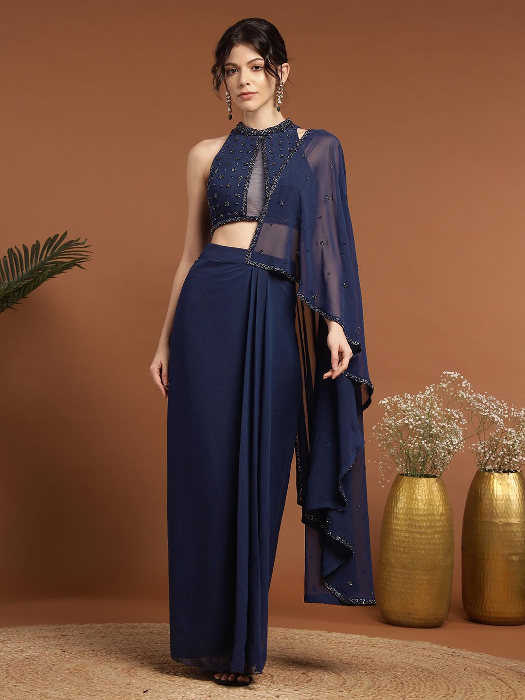 Experience opulence with our Mohnish Sari Set. Expertly crafted from premium georgette, each piece features intricate hand embroidery. The blouse features a beautiful neckline with eye-catching detailing and a show-stopping back, paired with a draped stitched saree. The set boasts intricate craftsmanship, perfect for intimate or formal occasions.