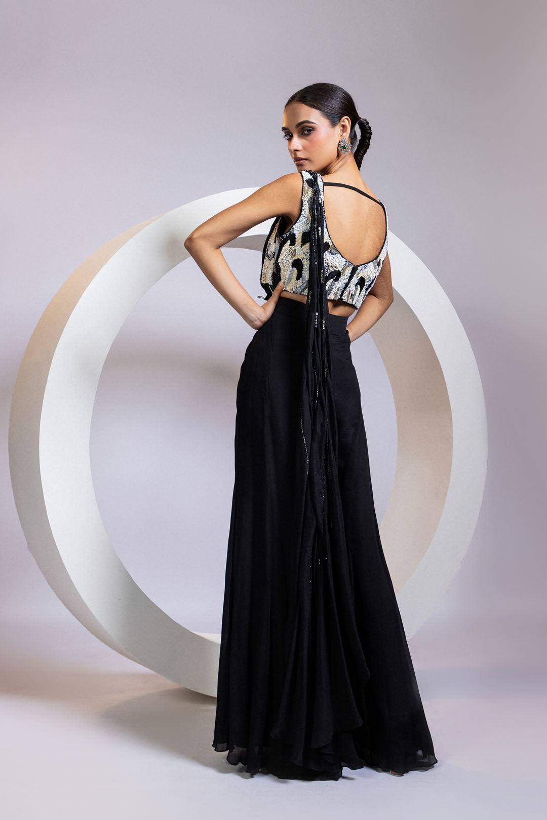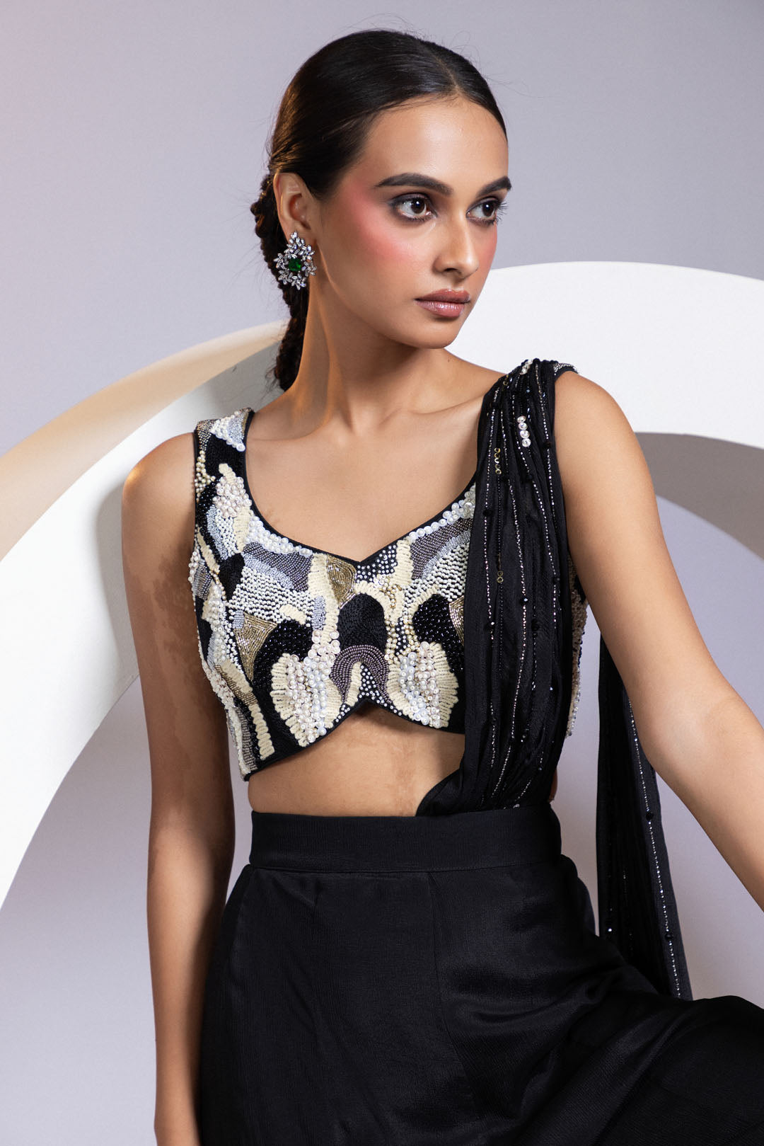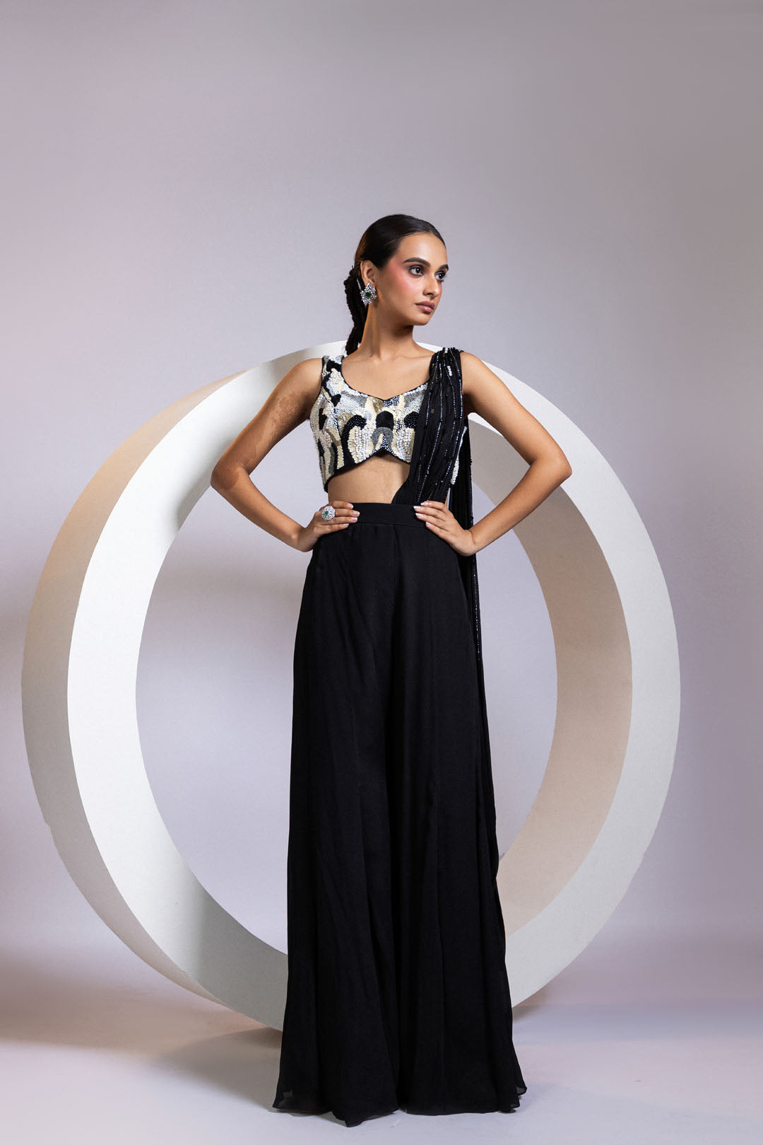 A three-piece coord set in chartreuse yellow, featuring a white inner layer and a statement cutwork top adorned with oversized 3D organza florals. Each bloom is finished with pearl clusters and fine beadwork for a soft, textured sparkle. Paired with wide-leg palazzo pants, the silhouette is crisp yet playful. A refreshing pick for daytime festivities and summer celebrations.