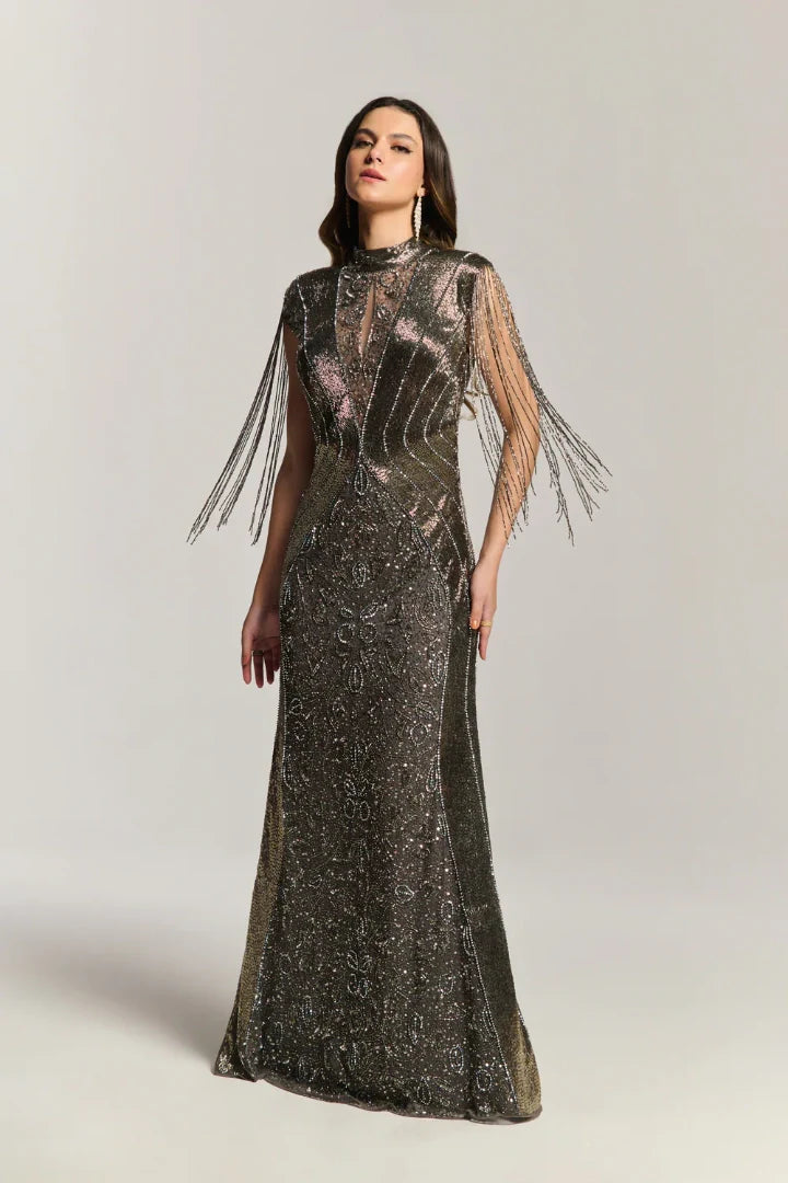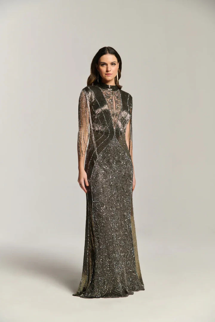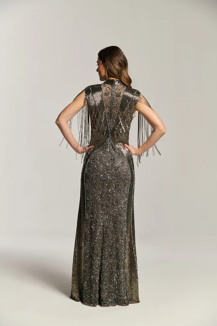 A glamorous sleeveless gown adorned with sequins and beads, featuring exquisite fringe details on the shoulders. The beading creates a stunning variety of patterns and textures, adding depth and visual interest to this chic and sophisticated piece.