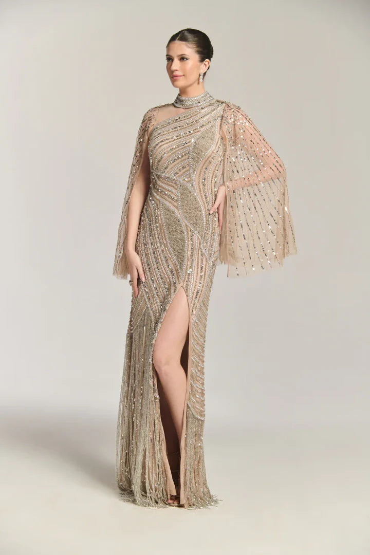 A captivating nude gown featuring a choker-style high neckline and dramatic cape-like long sleeves that elegantly fall off the shoulders. The gown boasts a daring thigh-high slit on the left side, adding a touch of bold sophistication. The bottom is adorned with multi-colored beading and fringe, creating a vibrant, eye-catching finish to this stunning design.