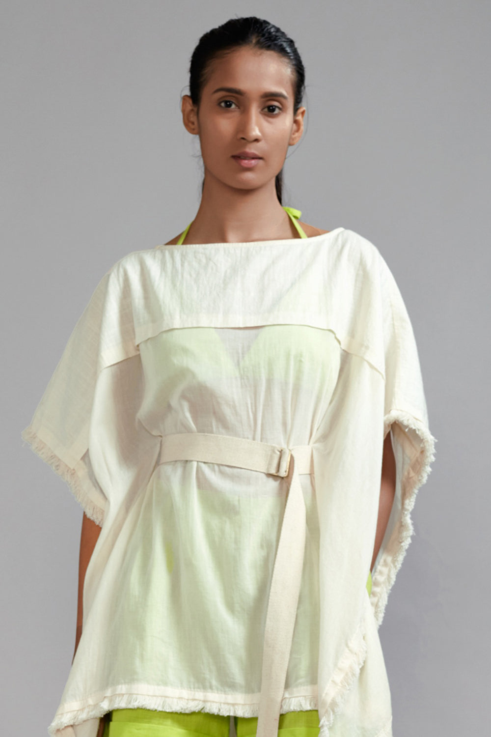Showcasing an off-white kaftan top in mul base with fringed detailing. it is paired with a belt. pair it with hoops earrings and wedges. perfect wear for a vacation.