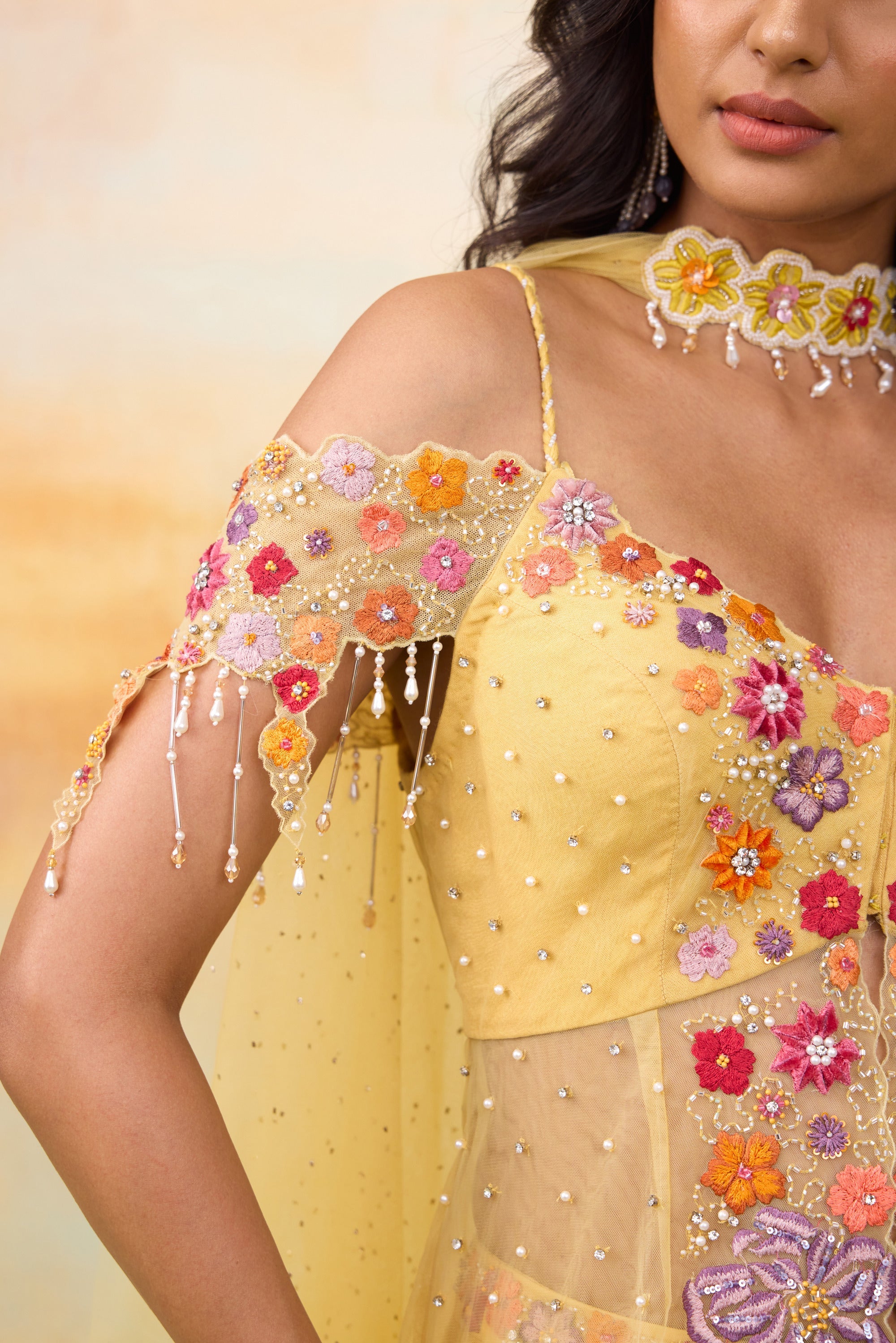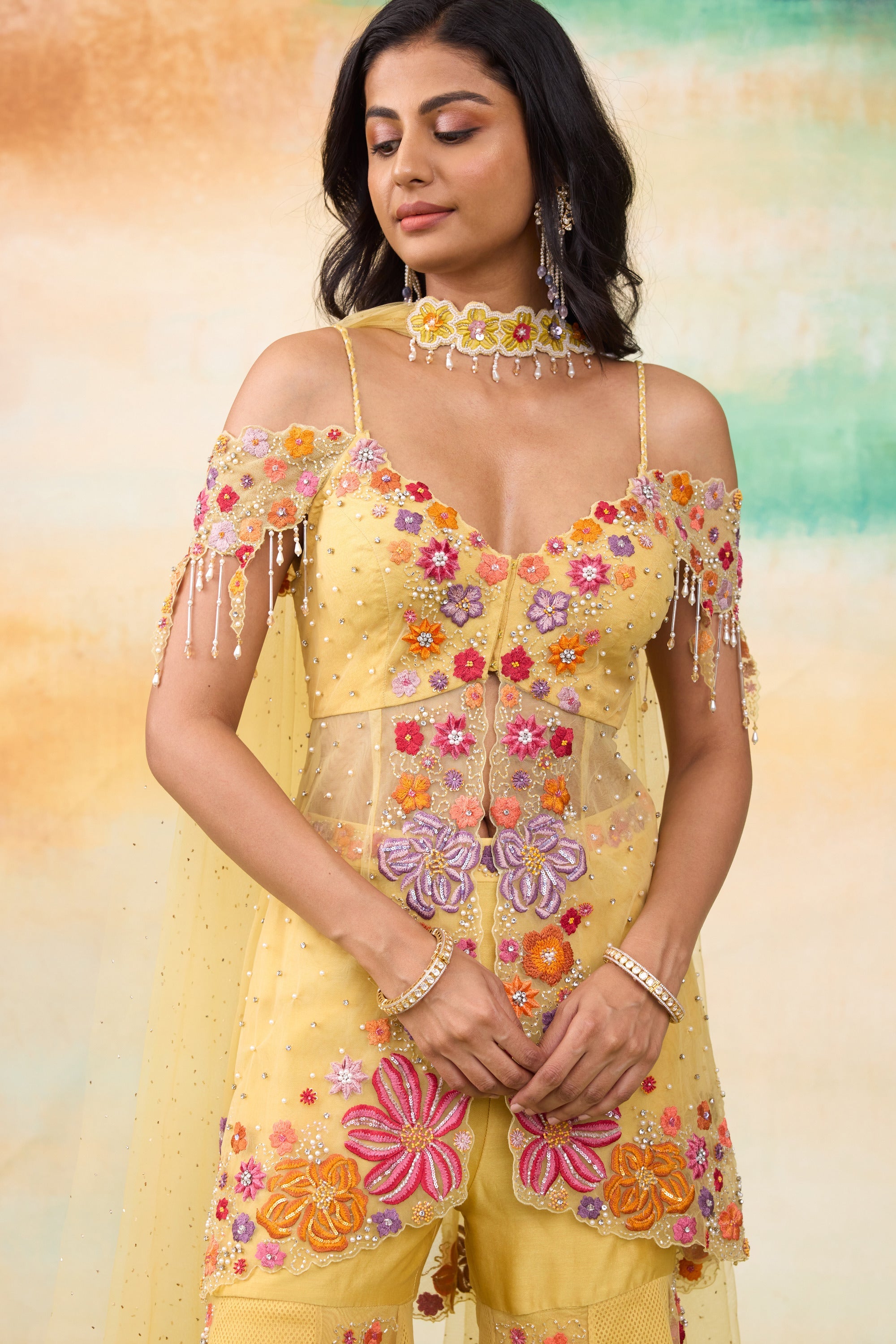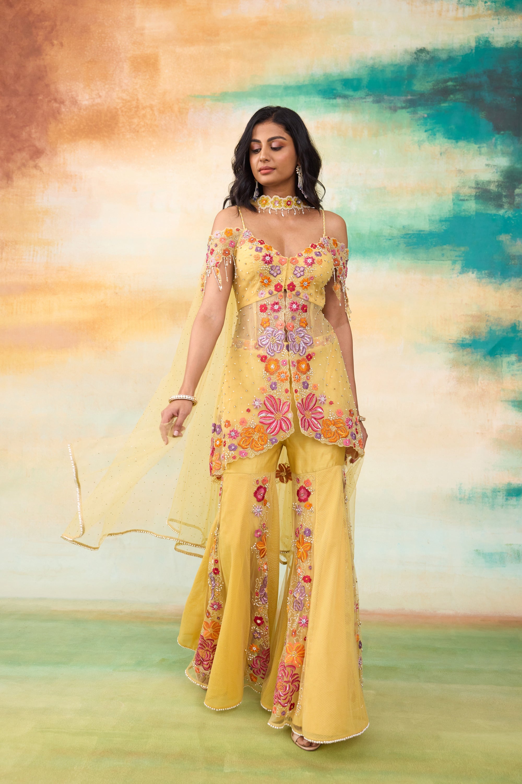 The Mulan sunrise yellow peplum gharara set is a mesmerizing blend of elegance and artistry . This stunning ensemble features a hand embellished peplum top, adorned with a captivating mix of micro to oversized colorful floral morifs and intricate handwork. The design is elevated with shimmering pearls, delicate cutwork detailing, dazzling sequined flowers, and graceful tone-on-tone tassels, exuding timeless sophistication. Paired with a beautifully crafted gharara and a floral cut choker style dupatta , this outfit radiates charm and is perfect for making an unforgettable statement.