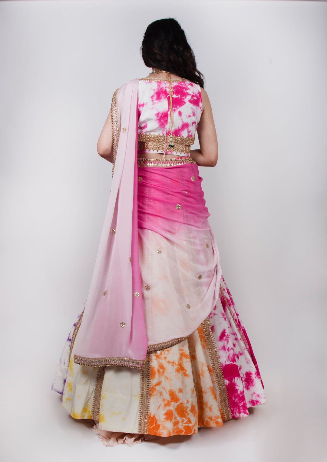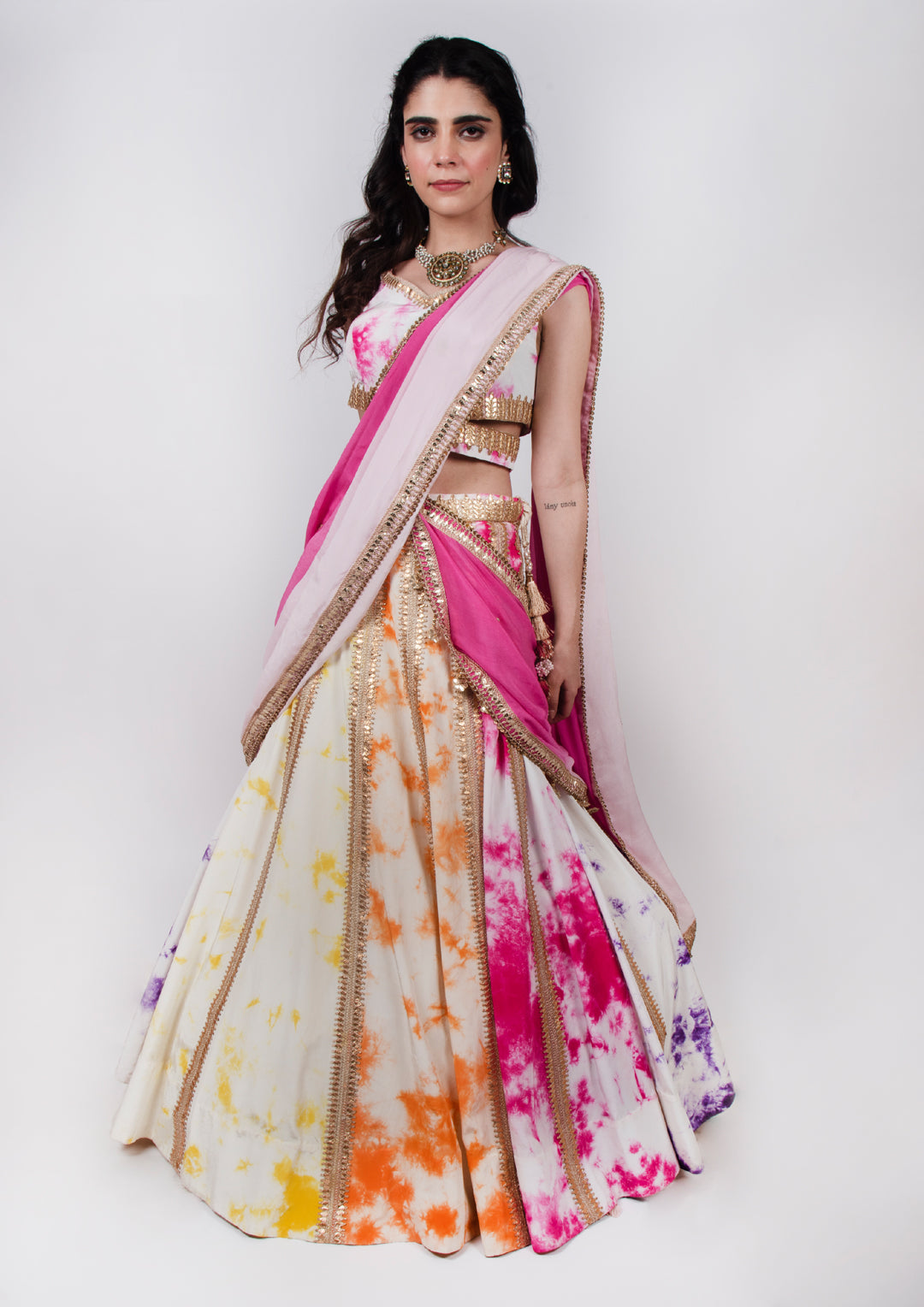 Featuring a dramatic multicolour bomb dye lehenga with gota work and cutout blouse with shaded dupatta. This piece consists of a blouse, lehenga and a dupatta. Length : blouse 15", lehenga 42
