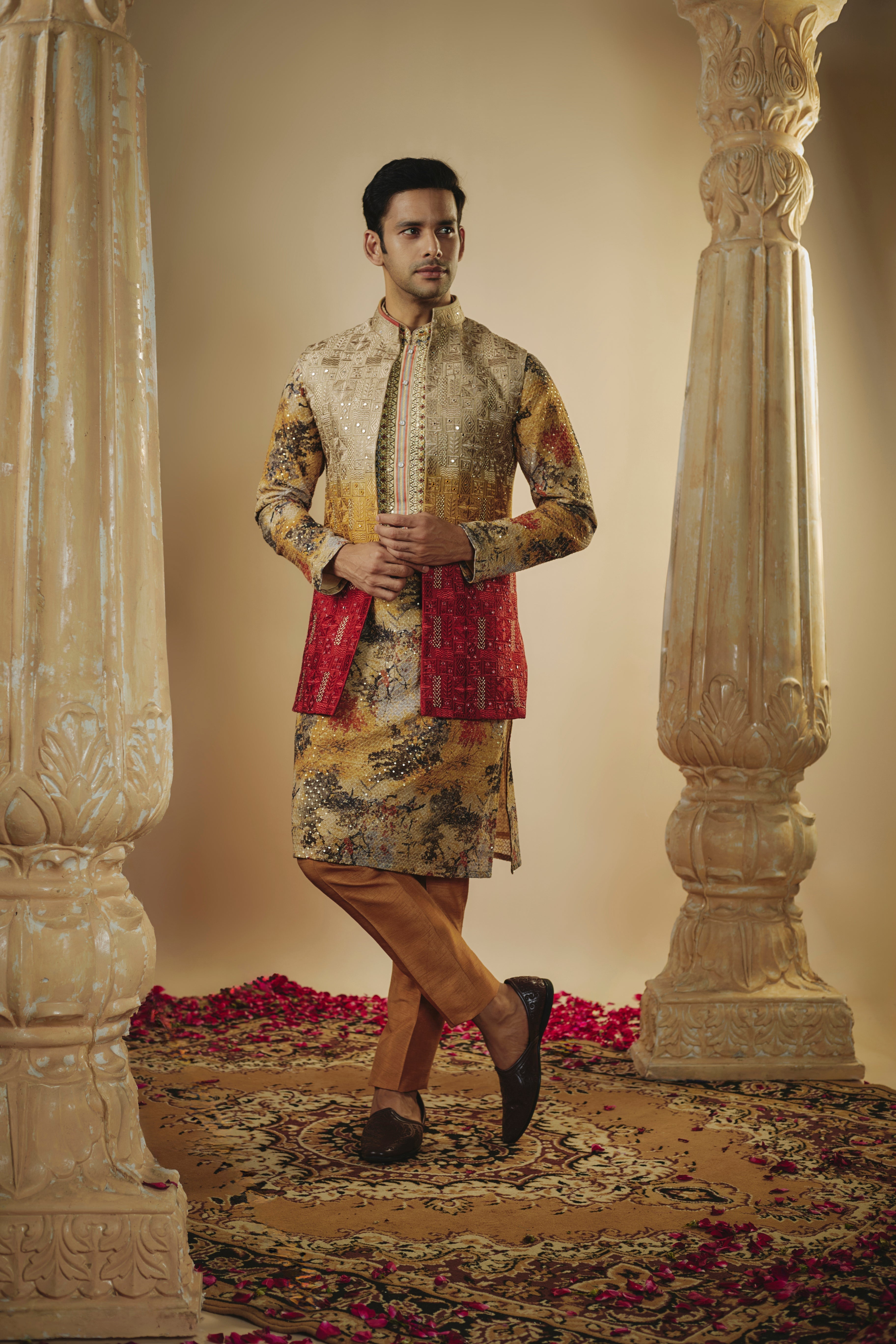 Multicoloured digital print lucknowi kurta with sequins and resham work with mirror and thread work ombre jacket paired with pants.