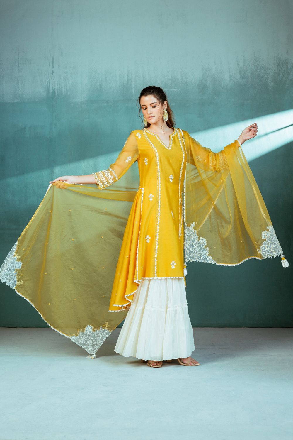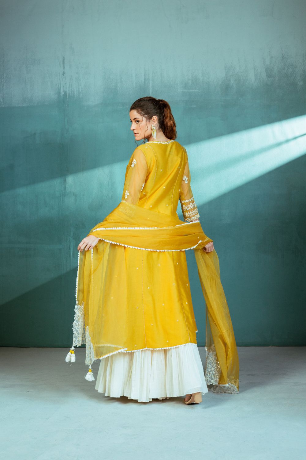 Mustard Yellow Chanderi Dori And Pearl Embroidered Godet Kurta With Ivory Mul Mul Tiered Sharara And Mustard Embroidered Organza Dupatta With Ivory Embroidered Corners And Inner Slip.