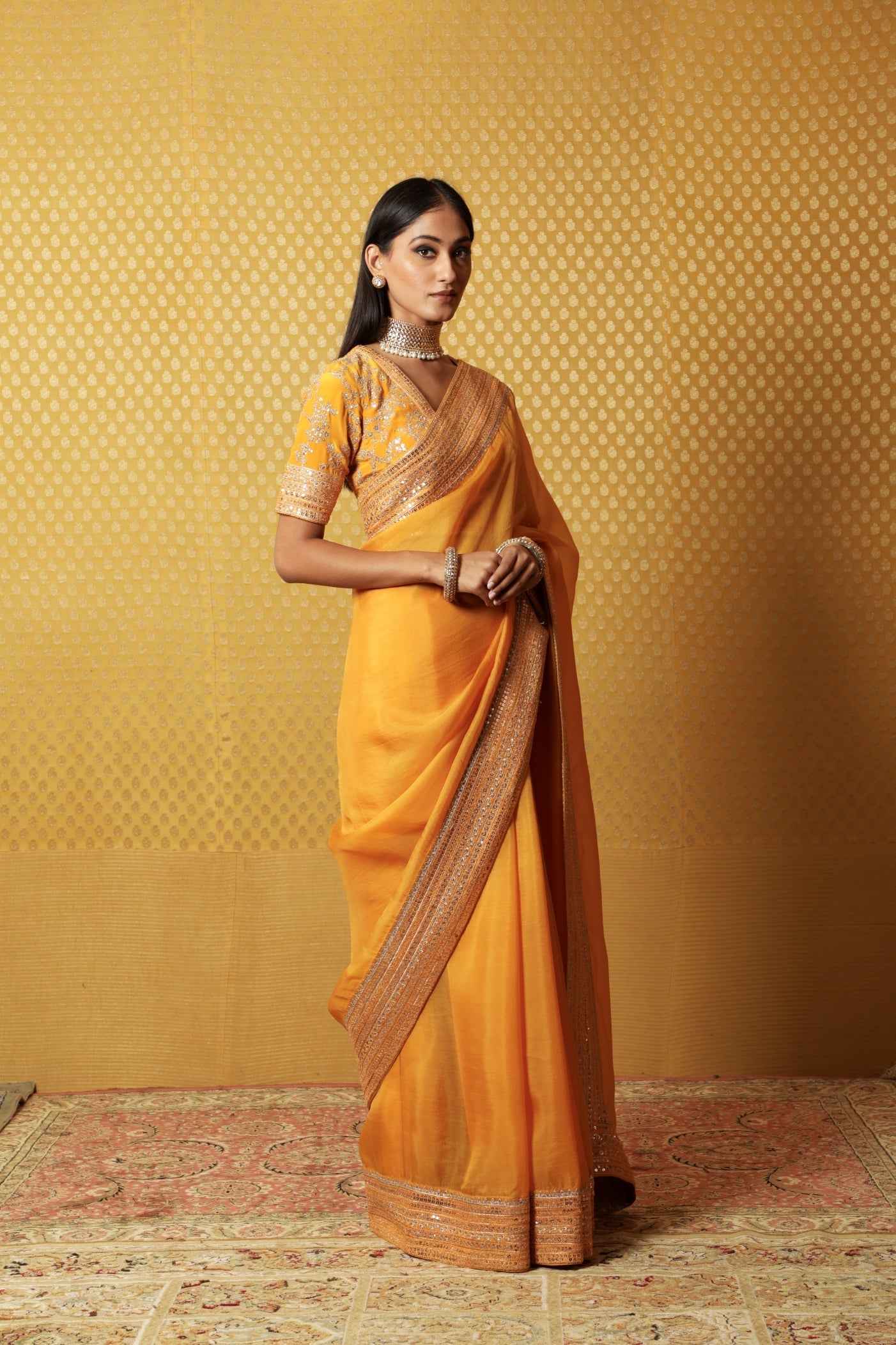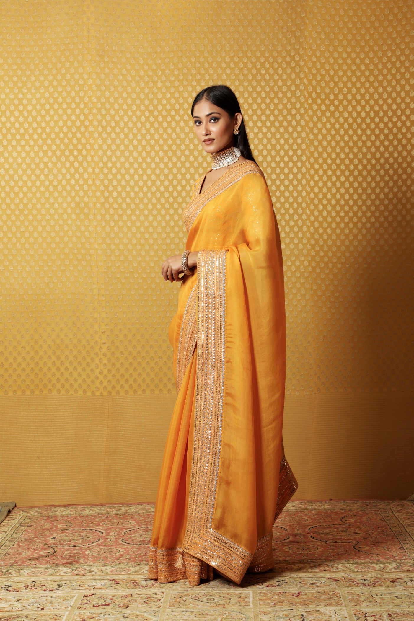 Mustard-Yellow Embroidered Pure Silk- Organza Saree-Blouse Set