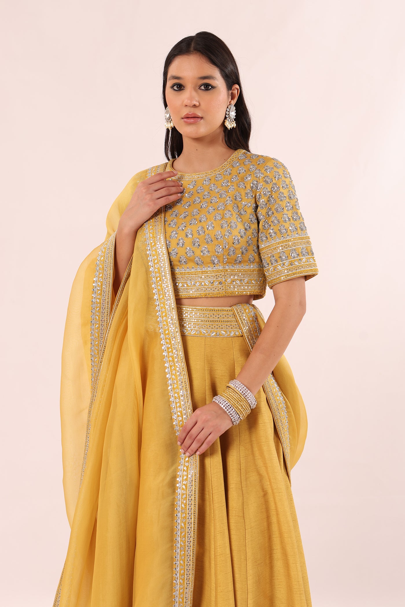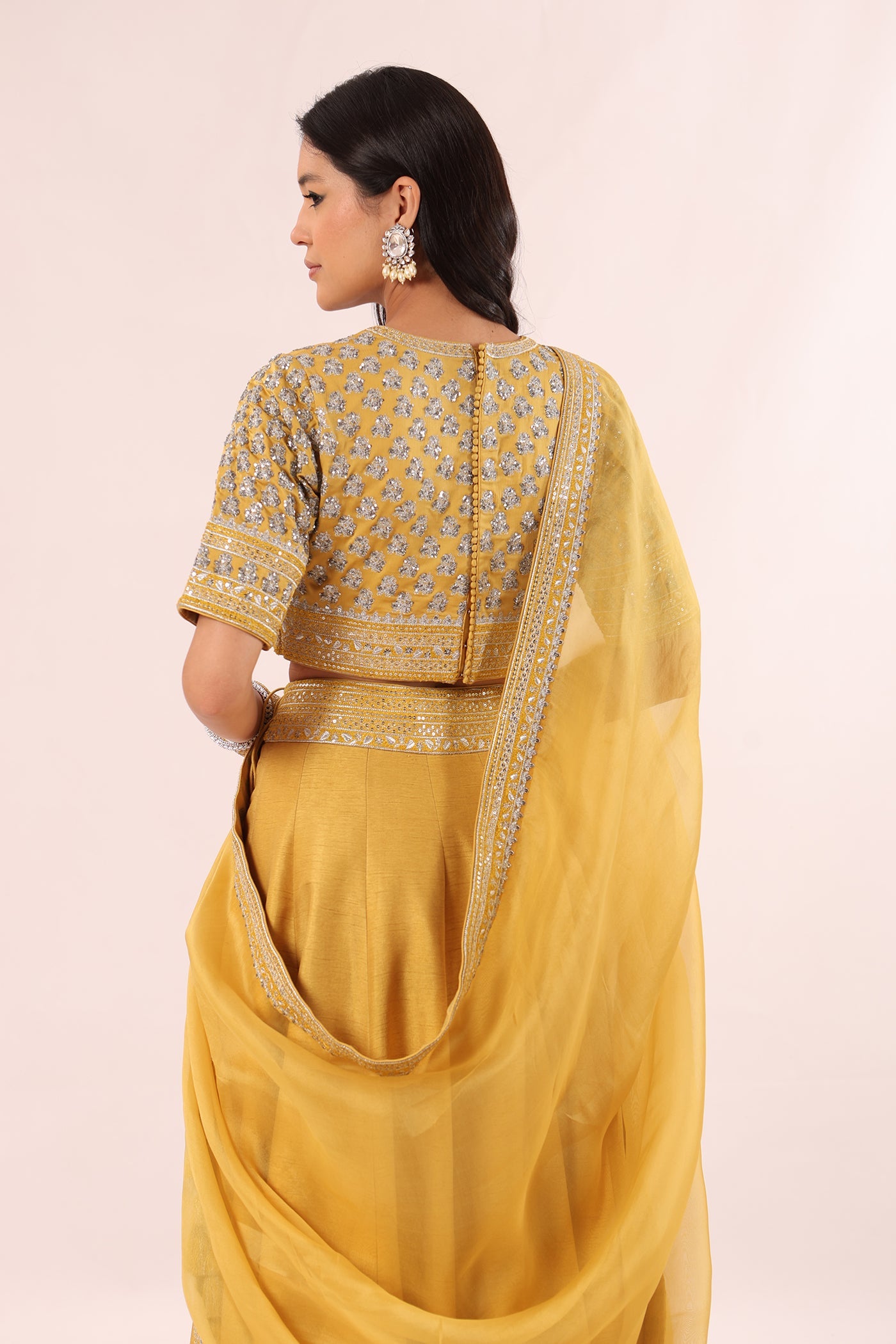 Mustard-Yellow Hand-Embroidered Pure Raw-Silk Lehenga-Blouse-Dupatta Set