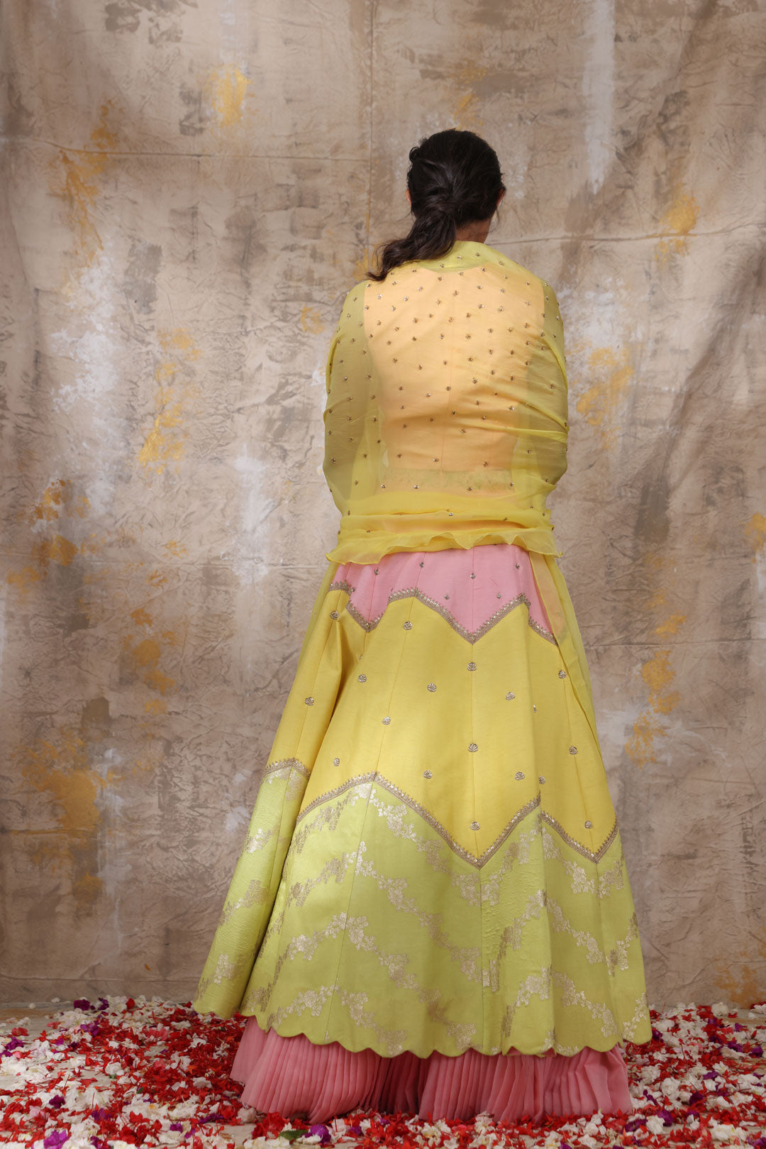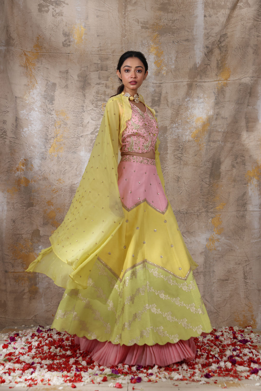 Multicolor chevron lehenga layered on a candy pink pleated underskirt, is well coordinated with zari worked blouse. A ruffled dupatta in canary yellow balances the whole look. Blouse length is 15.5" from the shoulder and 9" from the neckline. Lehenga length is 44". **The color may slightly vary due to screen lighting.