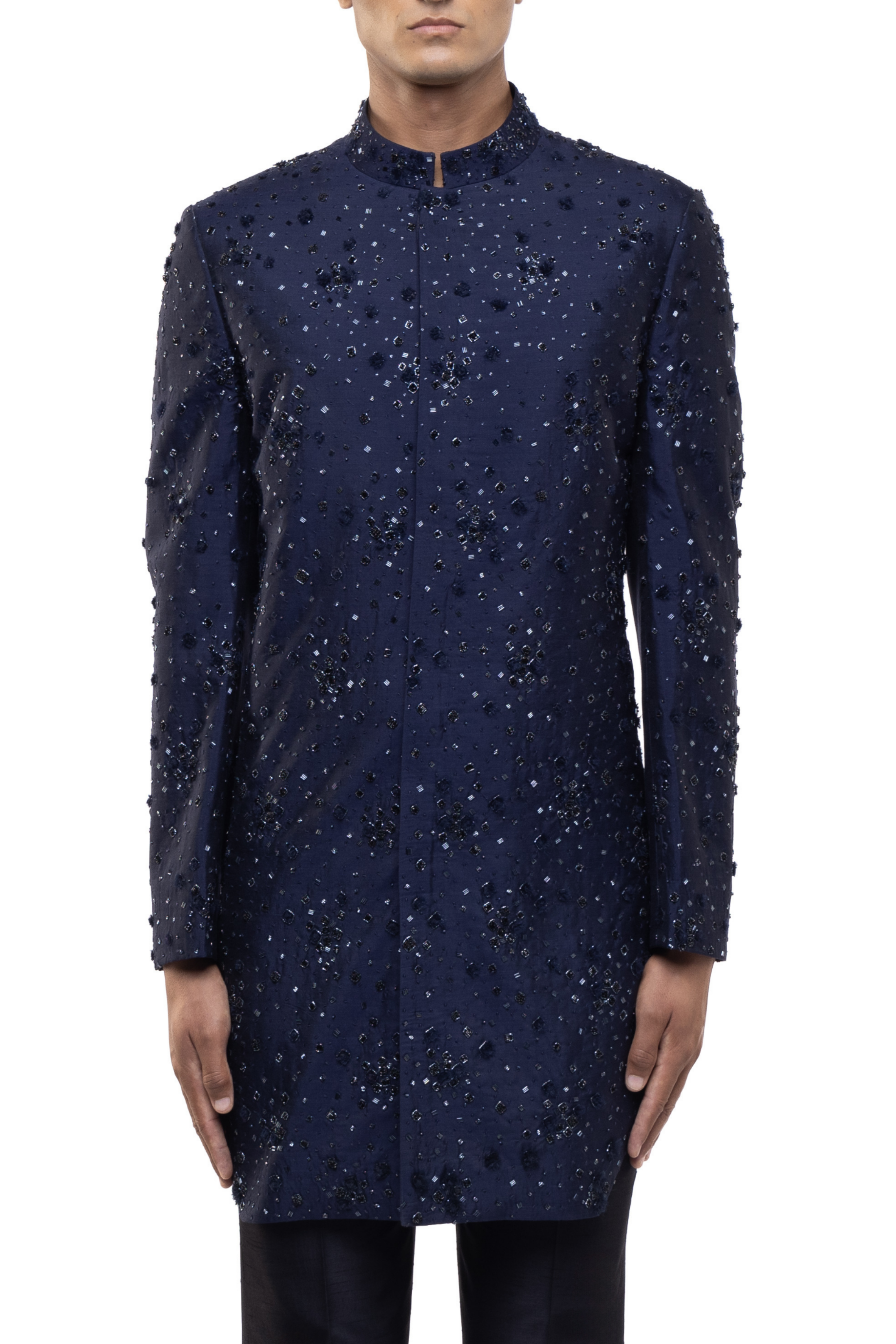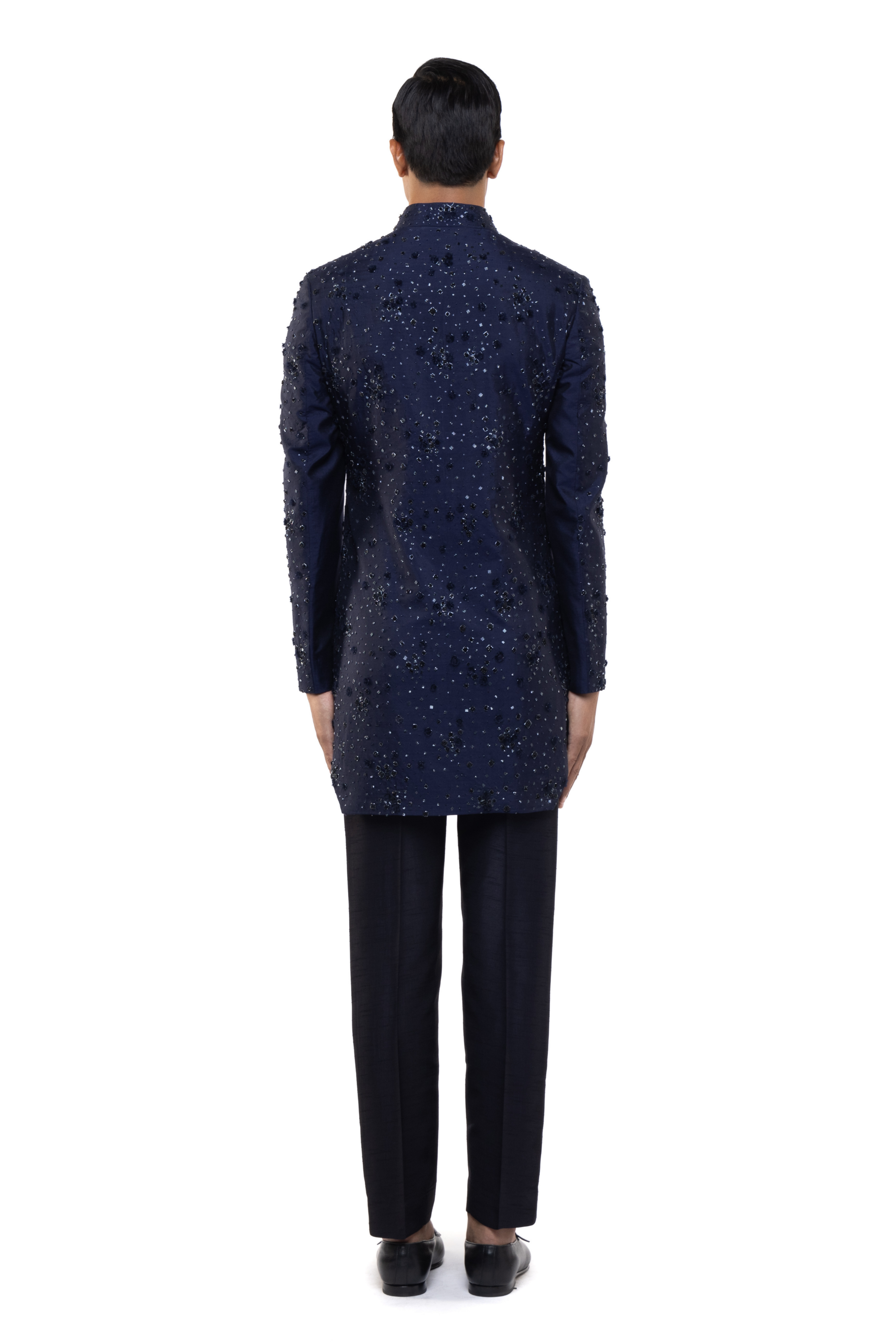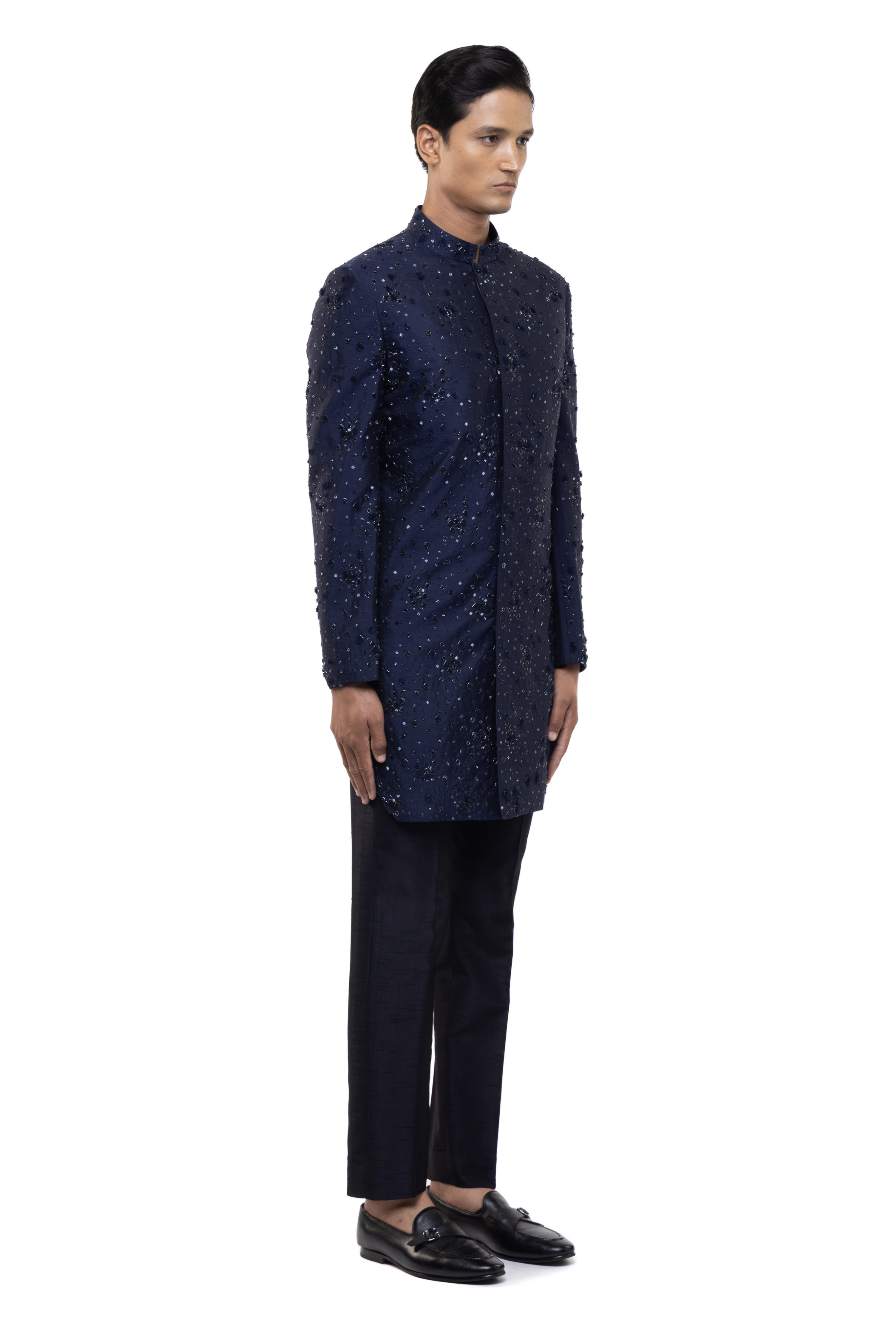 This navy organza sherwani, featuring intricate applique embroidery, makes a graceful statement for receptions, sangeet, or cocktail gatherings.