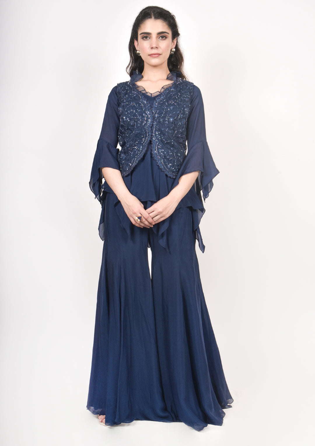 Featuring a Navy blue asymmetric peplum with bell sleeves paired with panel sharara and a waistcoat embellished with threadwork, cutdana and sequence. This piece consists of a top, pants & jacket. Length: jacket 15" top LONG LENGTH 35" SHORT 28" , pants 42".