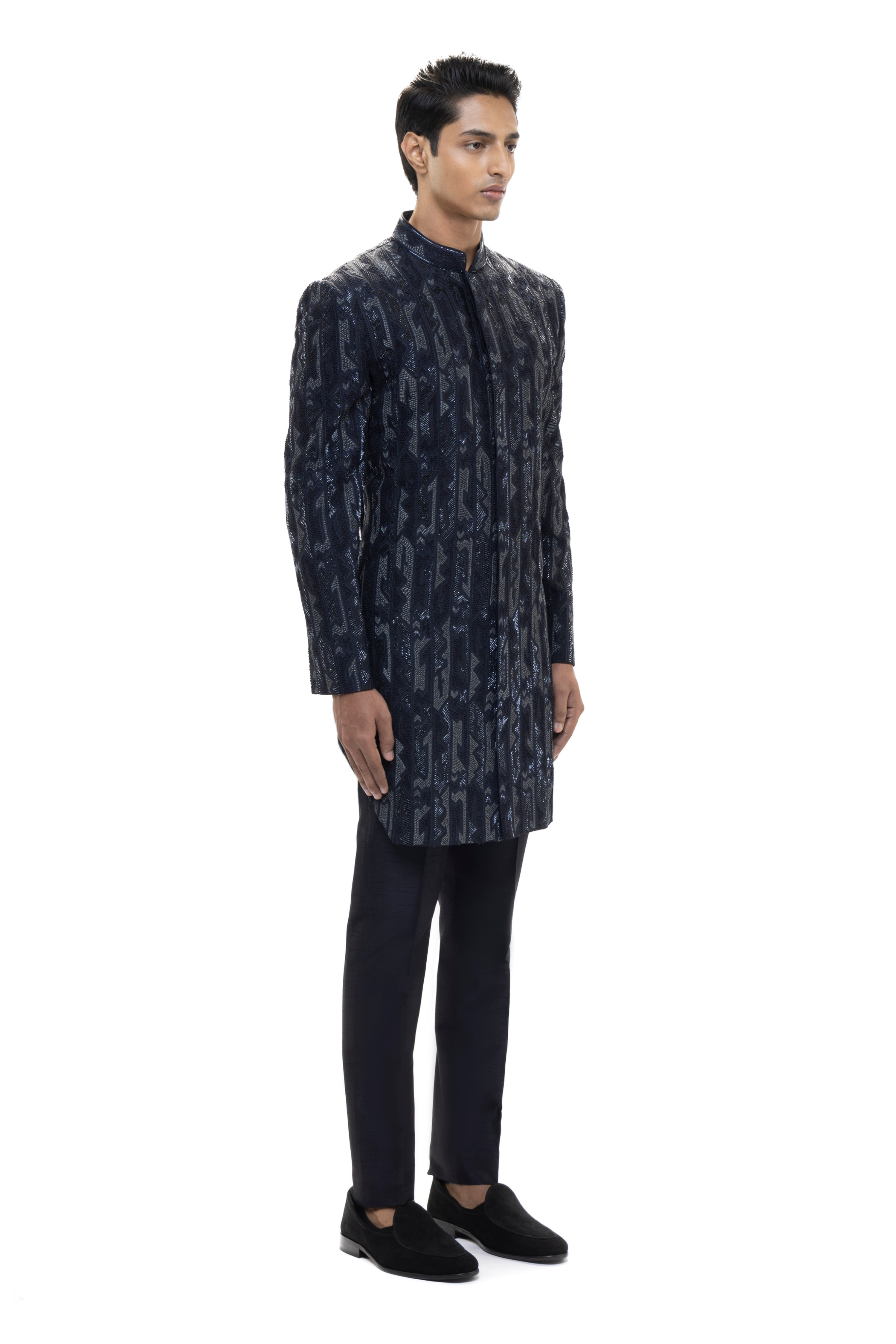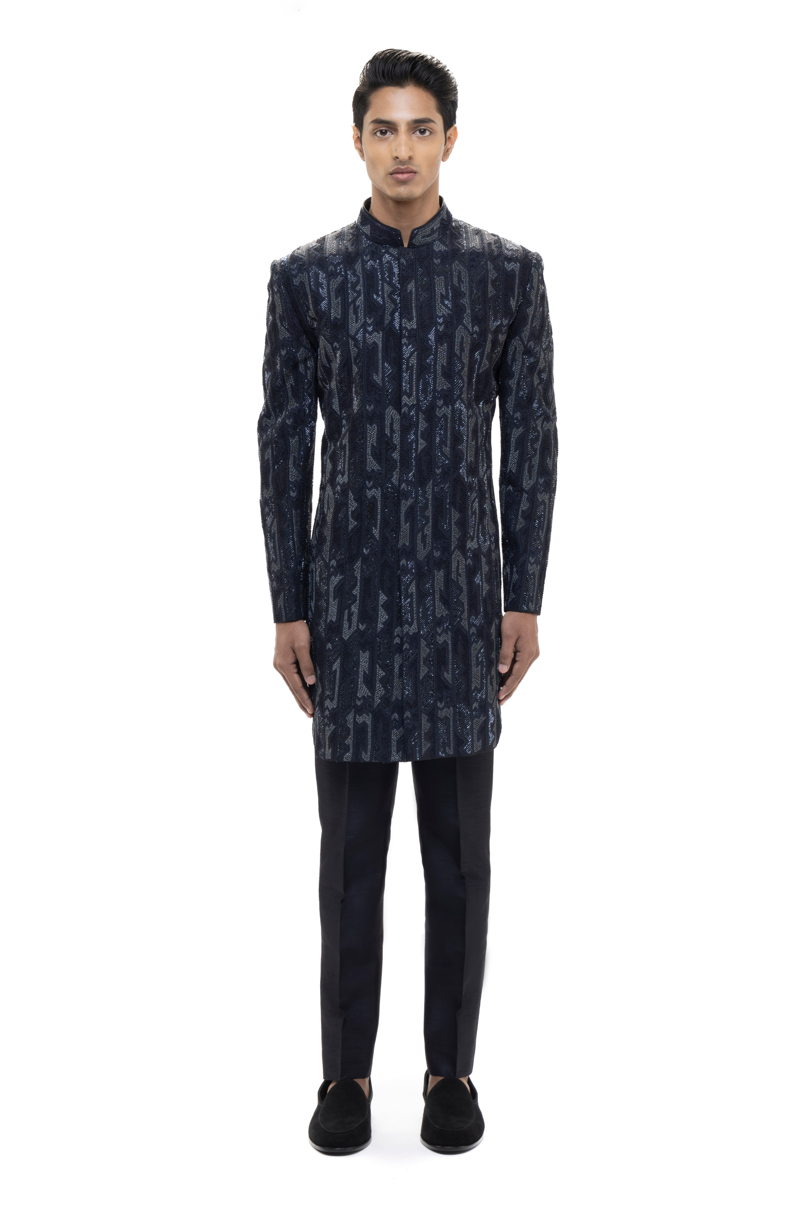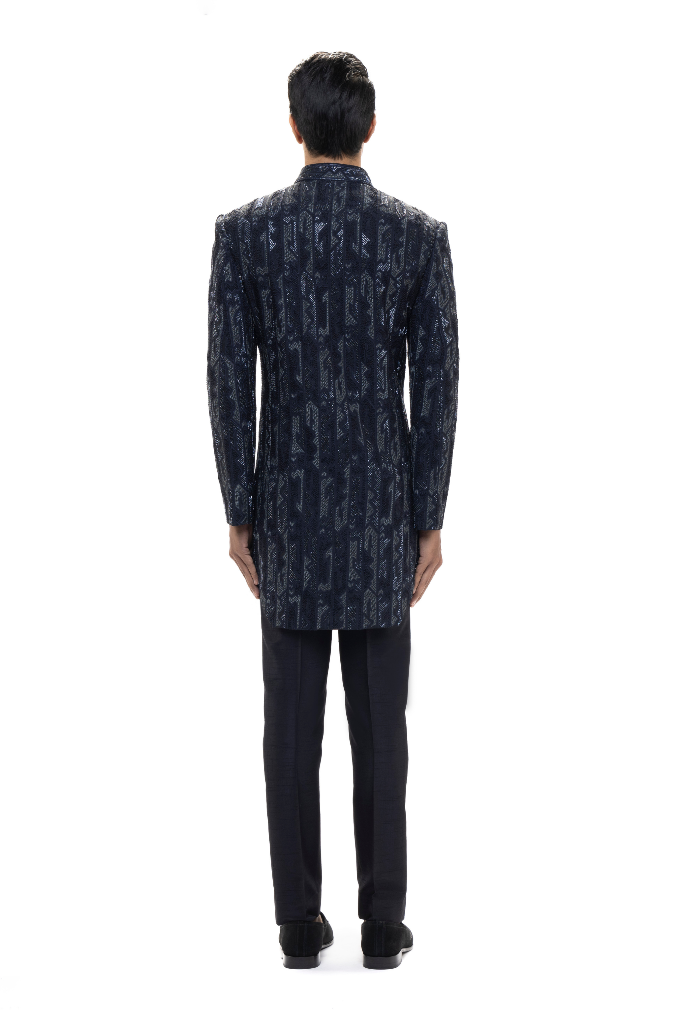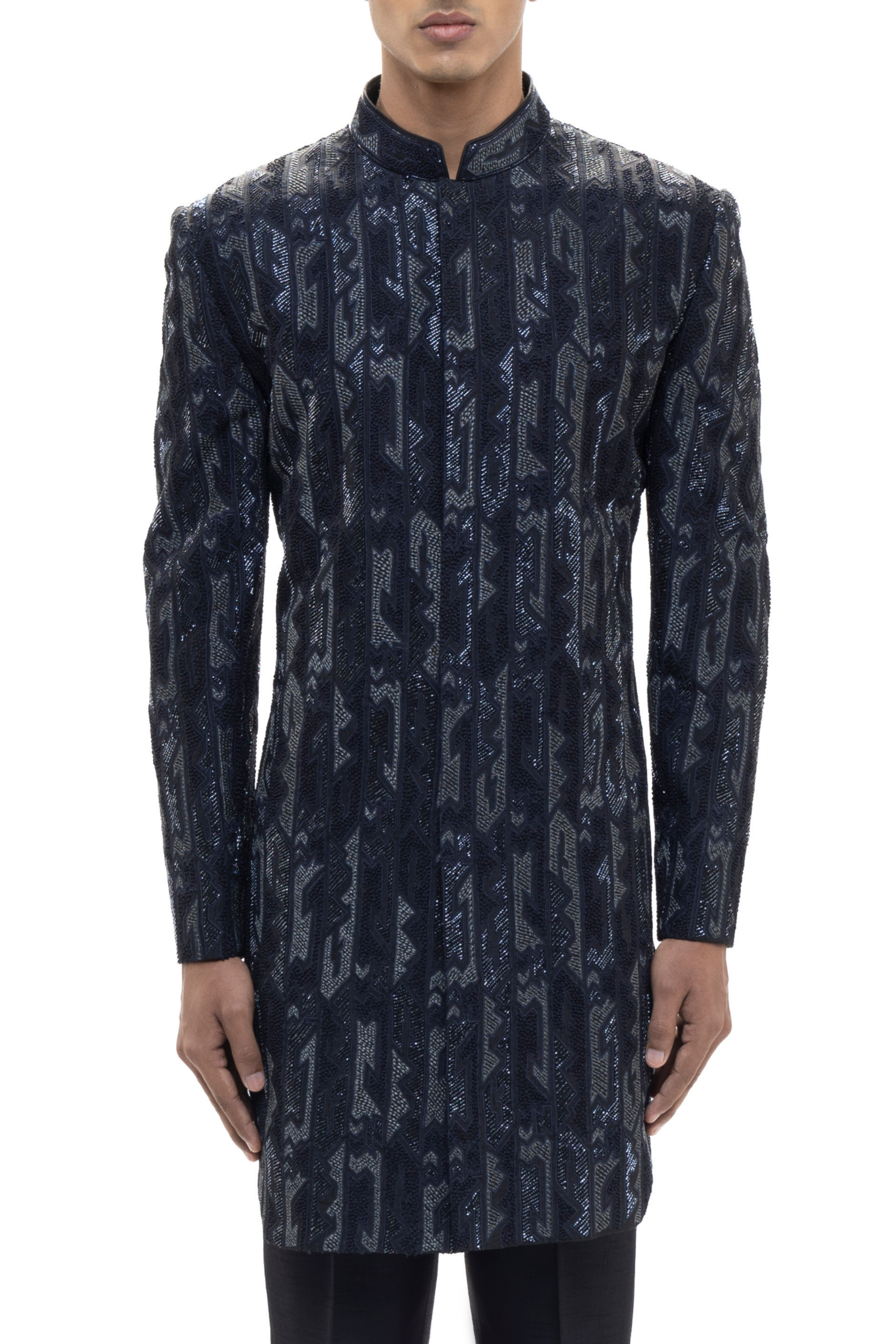 Featuring Aztec embroidery, this navy blue silk sherwani set is a striking choice for reception, sangeet, cocktail, and engagement events.