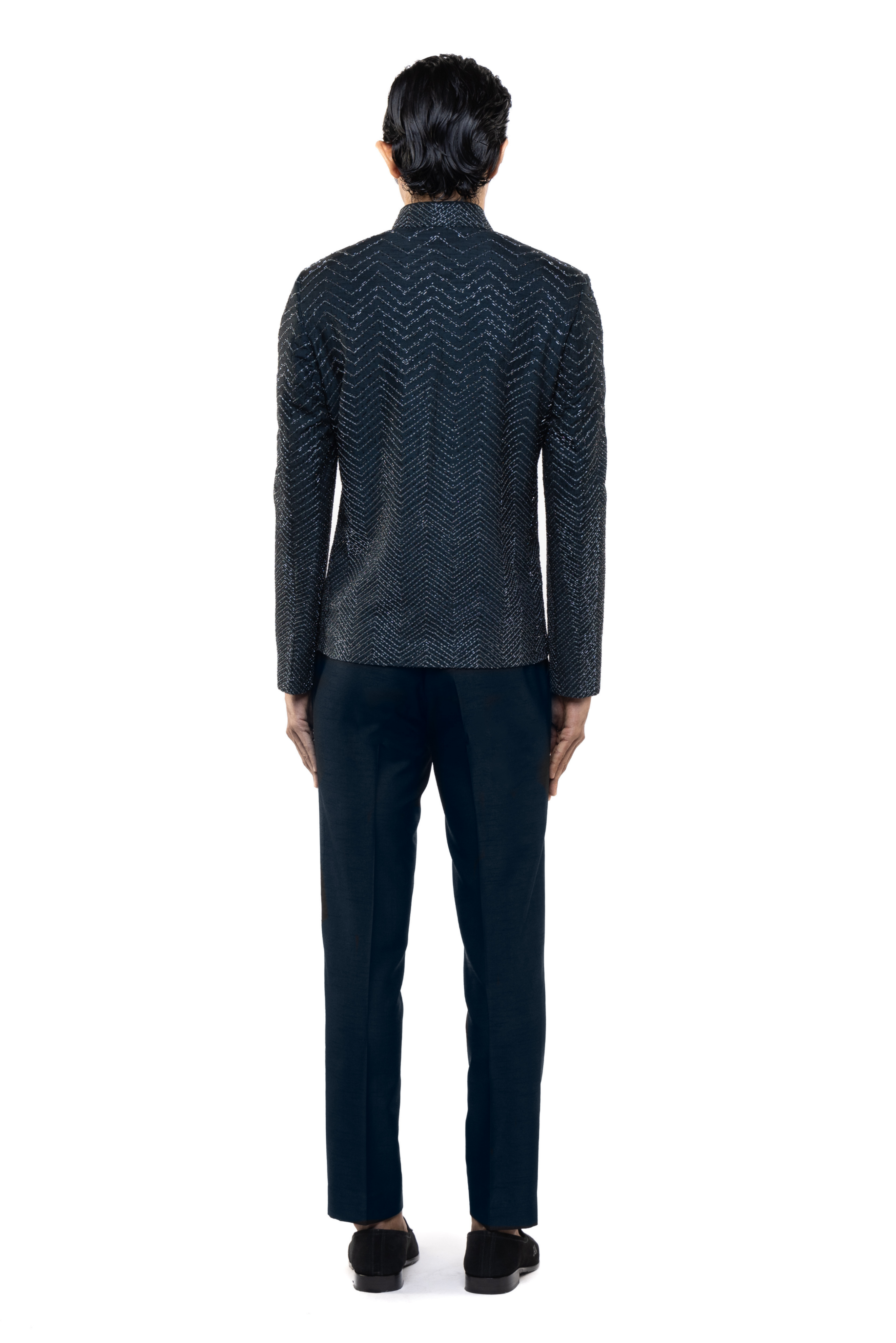 A navy blue silk bandhgala set with geometric embroidery, ideal for ethnic, festive, sangeet, and engagement celebrations with a modern edge.