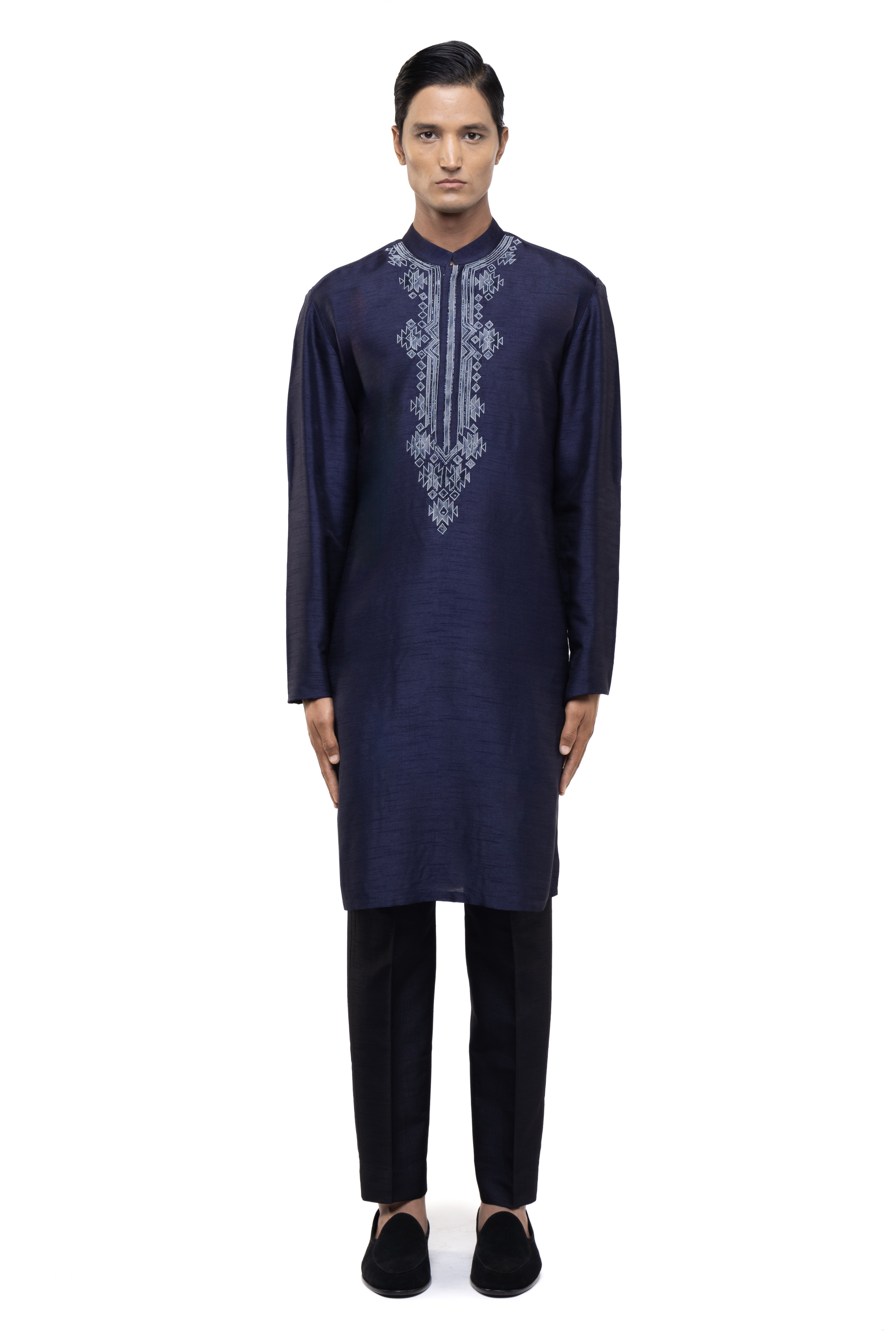 A navy blue and white silk embroidered kurta set, combining classic and contemporary styles, perfect for ethnic and festive occasions.