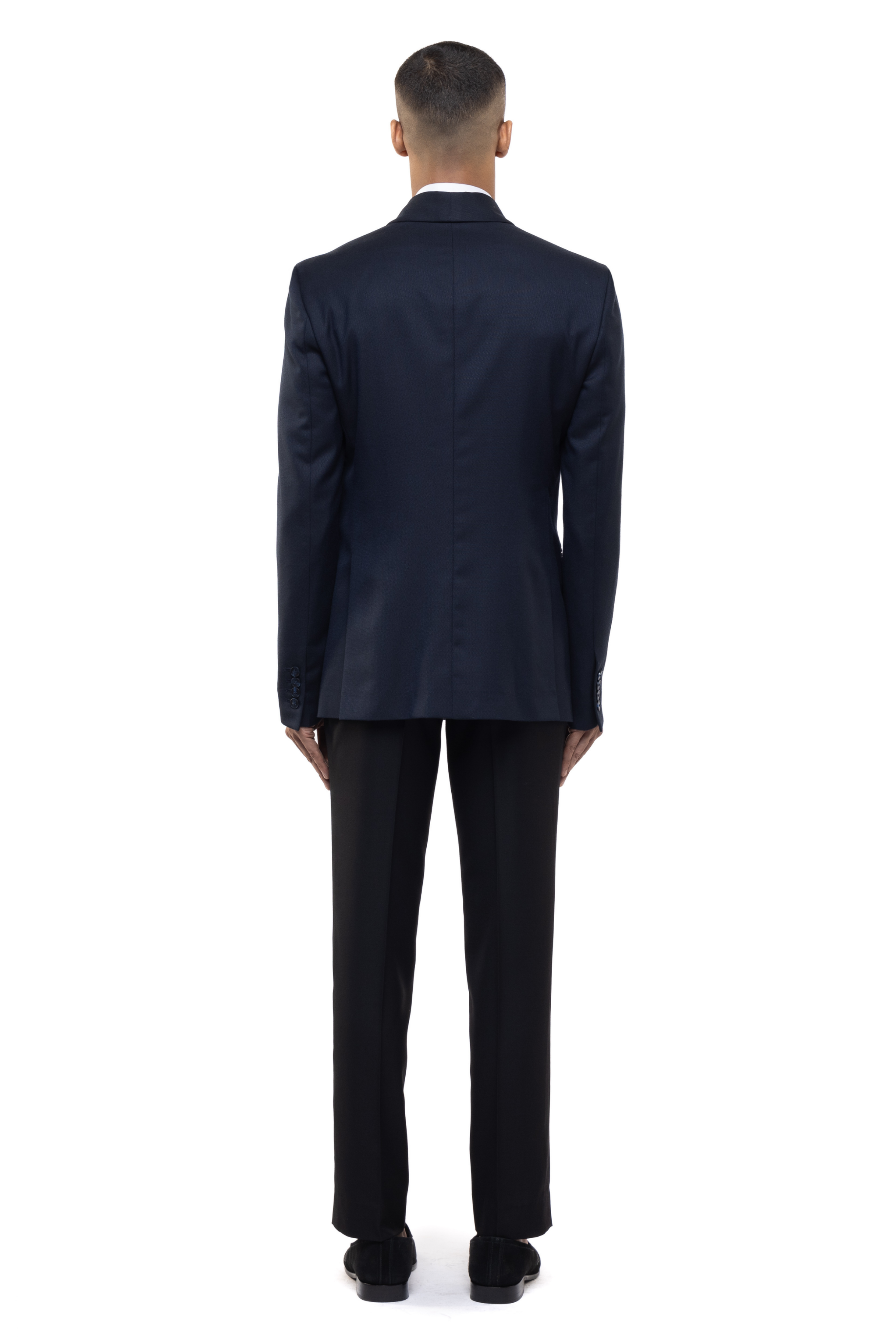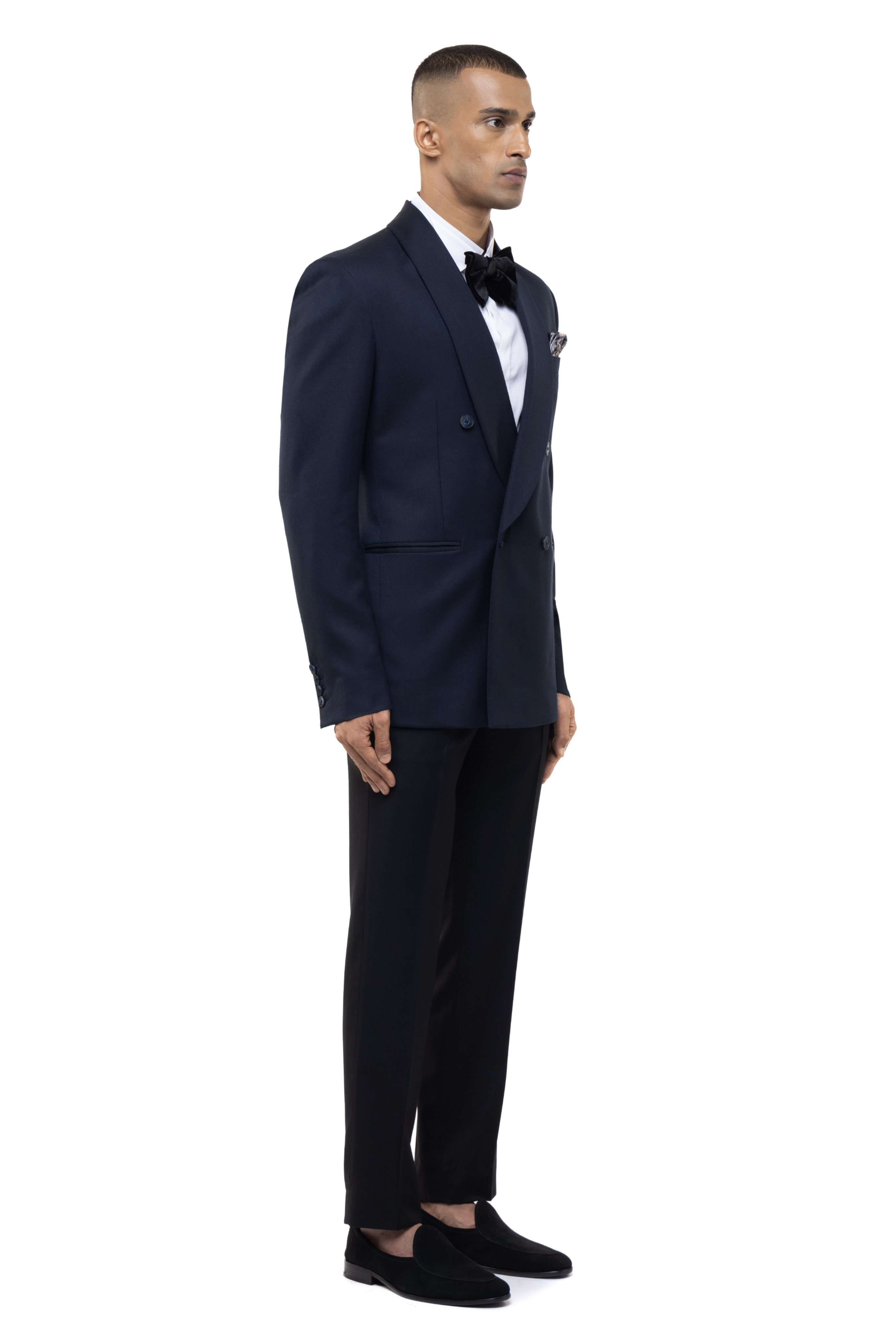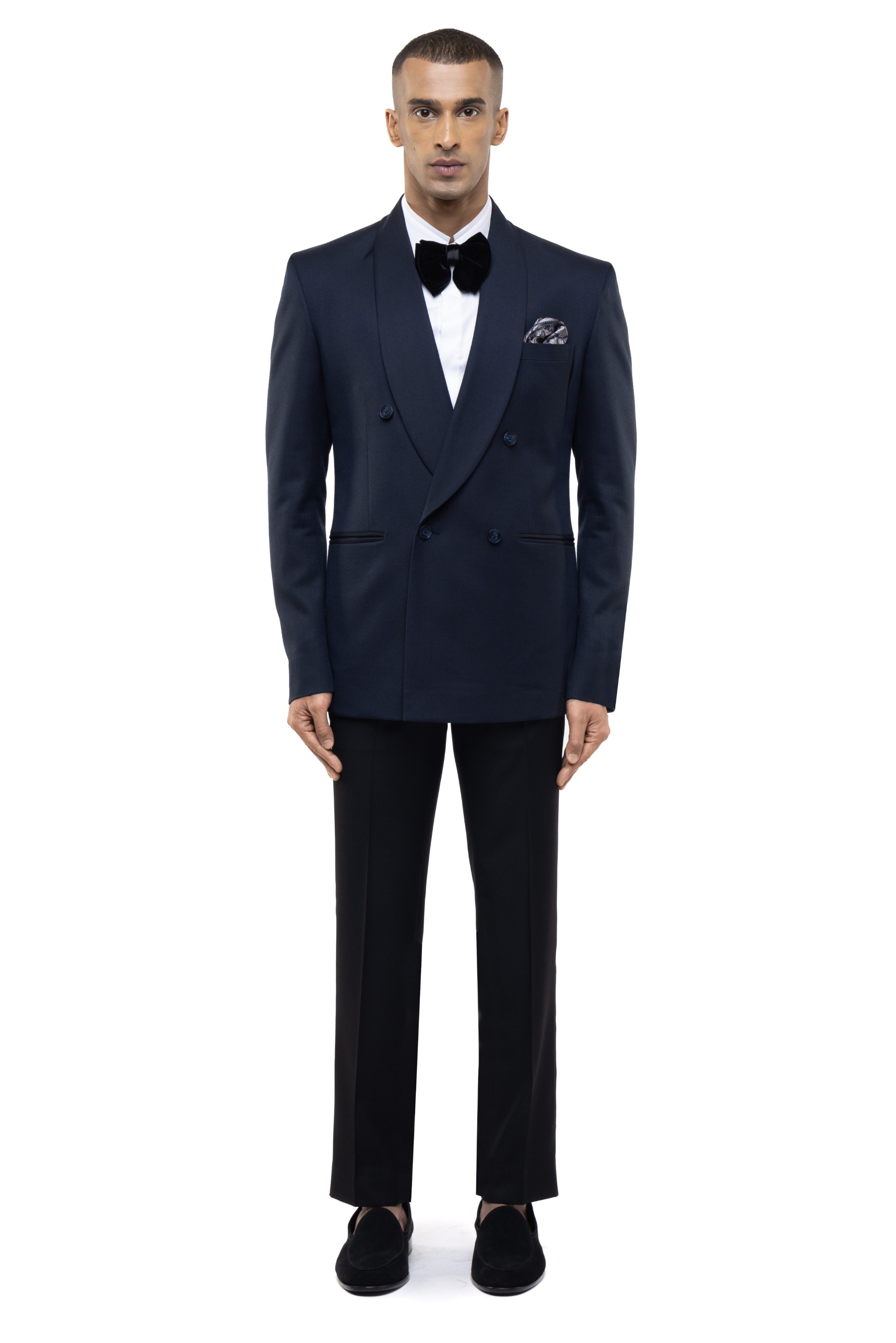 This black velvet tuxedo with a shawl lapel and double-breasted knot closure is perfect for reception, sangeet, or cocktail events.