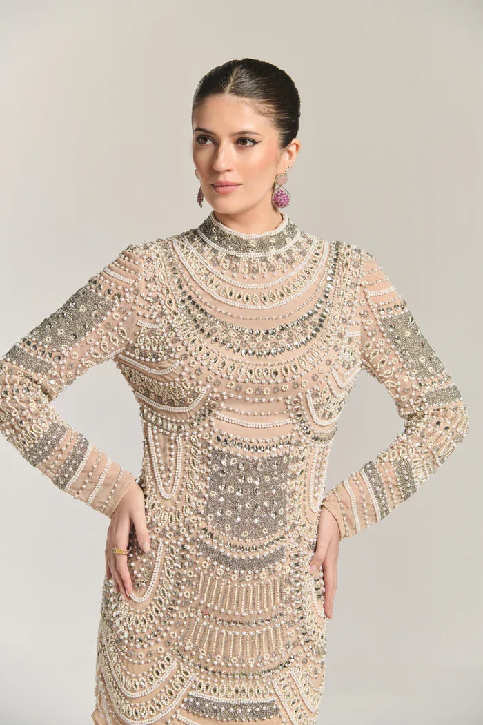 A stunning long-sleeved mini dress, heavily embellished with pearls and silver embellishments arranged in an abstract pattern. Curved lines, ovals, and circles create a visually striking design, adding texture and a touch of luxury to this bold and sophisticated piece.